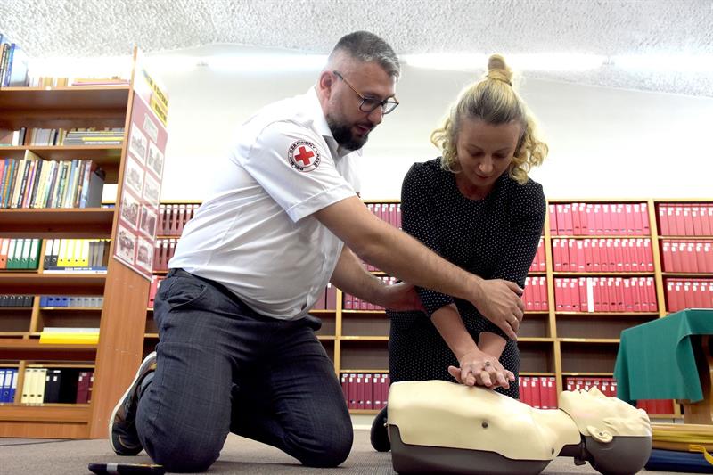 Z użyciem fantomu instruował, w jaki sposób należy udzielać pierwszej pomocy przedmedycznej. Wyjaśnił przy tym, jak posługiwać się defibrylatorem w przypadku, gdy pomoc potrzebna jest osobie, u której nastąpiło zatrzymanie akcji serca.