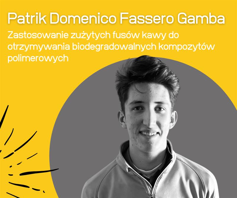 Patrik od dziecka pasjonuje się roślinami. Jako pierwszy na świecie stworzył sposób otrzymania kompozytu biodegradowalnego w postaci folii skrobiowej z wykorzystaniem zużytych fusów kawy, które stanowią materiał odpadowy. W finale przedstawi swój projekt dotyczący zastosowania zużytych fusów kawy do otrzymywania biodegradowalnych kompozytów polimerowych. Projekt polega na jednoczesnym wykorzystaniu materiału odpadowego oraz wytworzeniu z niego naturalnego w pełni biodegradowalnego kompozytu, który może mieć zastosowanie w produkcji doniczek czy taśm nasiennych. Doniczki takie umieszczone w glebie ulegają degradacji, a zawarte w nich fusy od kawy stanowią naturalny nawóz dla rośliny. Takie wykorzystanie odpadów stanowi rozwiązanie ekonomiczne i przyjazne dla środowiska naturalnego.