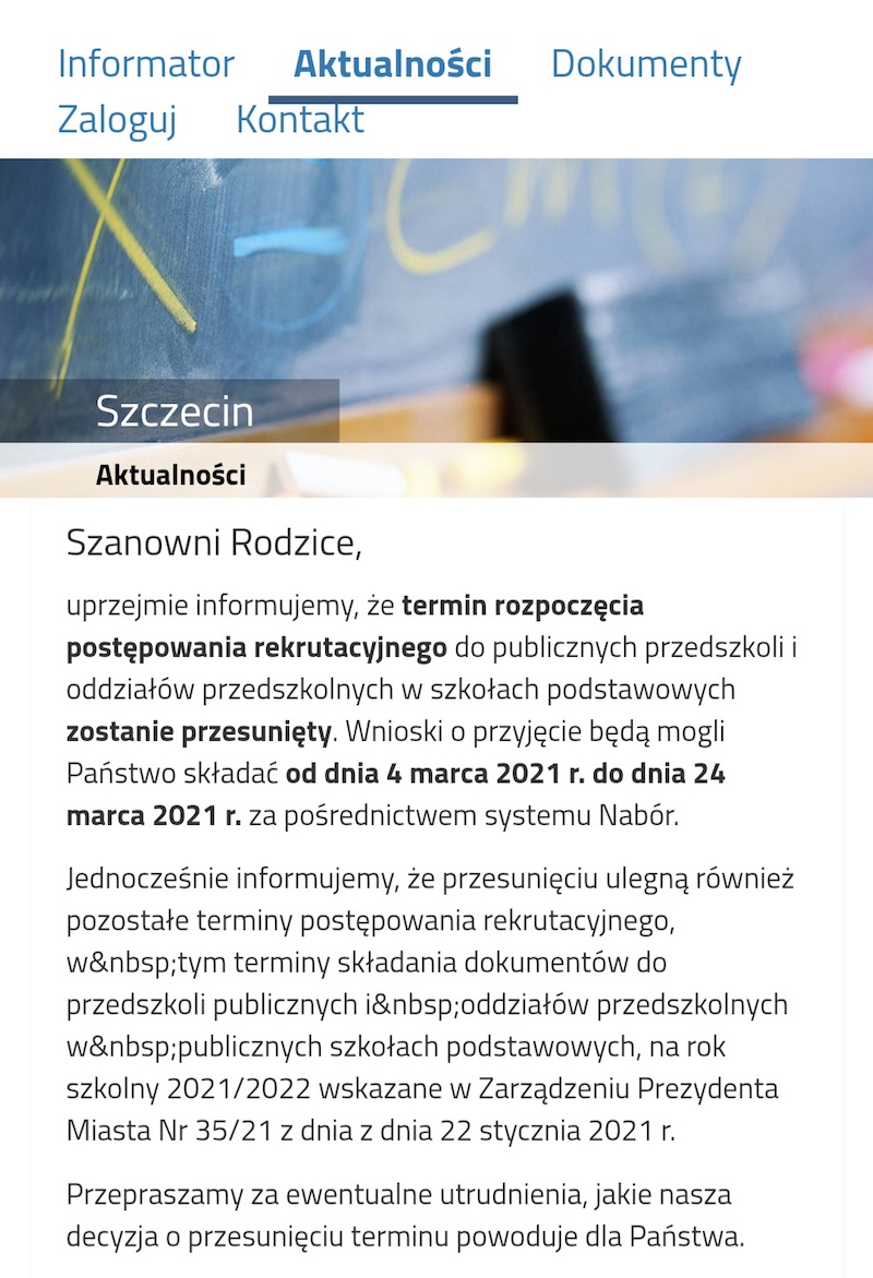 W piątek na stronie www.nabor.pcss.pl/szczecin, gdzie od 1 marca miała wystartować rekrutacja do publicznych przedszkoli, ich filii oraz oddziałów przedszkolnych na rok szkolny 2021/2022, w zakładce "aktualności" pojawiła się informacja, iż tegoroczny nabór zostanie przesunięty - zapisów do szczecińskich placówek rodzice i opiekunowie maluchów mogą dokonać od czwartku 4 marca. Przedłużony został również termin końcowy zapisów - to 24 marca. Nie ma za to podanej daty zakończenia procesu rekrutacji oraz terminu drugiego naboru dla tych dzieci, które nie dostały się do wybranych przez opiekunów przedszkoli.