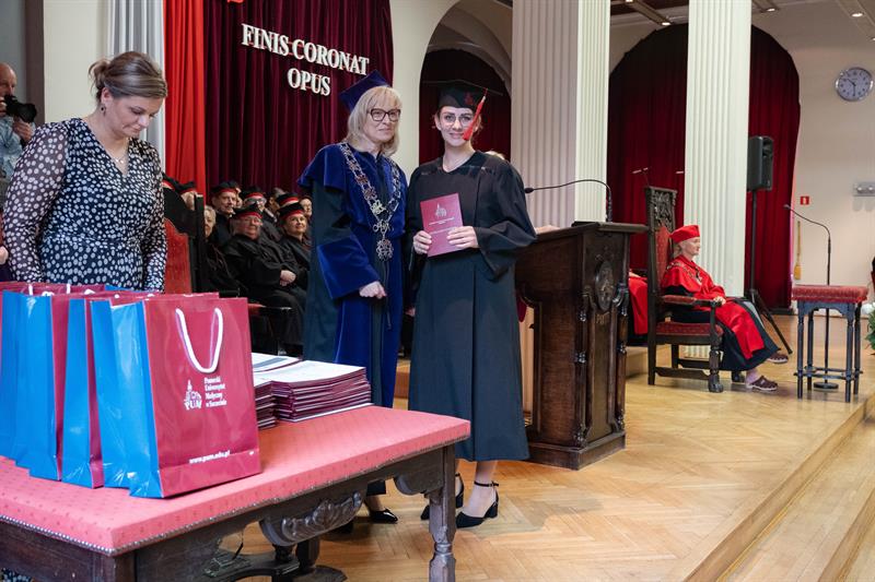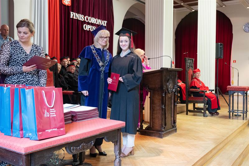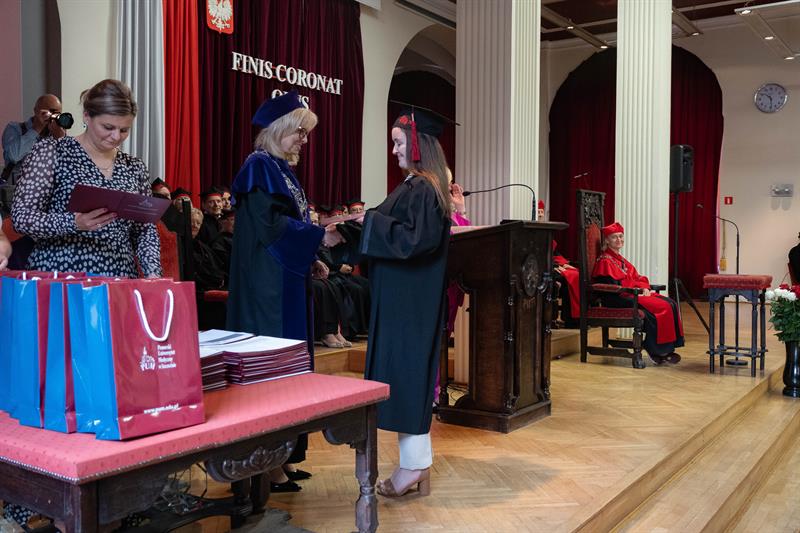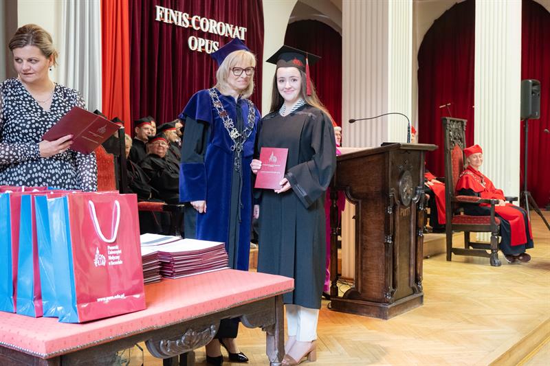 - To sala, która pamięta kilkadziesiąt pokoleń absolwentów tej uczelni - mówiła do zgromadzonych absolwentów prof. dr hab. n. med. Edyta Paczkowska, dziekan Wydziału Medycyny i Stomatologii PUM. - Sześć lat temu, w październiku 2018 roku, w tym zabytkowym budynku przy ul. Rybackiej w Szczecinie rozpoczęła się państwa droga ku medycynie, tak głęboko związana z Pomorskim Uniwersytetem Medycznym. Dziś kończą państwo ten ważny etap drogi. Teraz czas na kolejny - pracę, wybranie specjalizacji. To przyszłość, która się przed wami otwiera. Zostaliście w uczelni wyposażeni w wiedzę, umiejętności; wszystko, co potrzebne w zawodzie lekarza, brakuje wam tylko doświadczenia, ale to przyjdzie z czasem.
