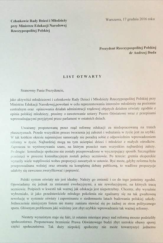 Radę Dzieci i Młodzieży przy Ministrze Edukacji Narodowej powoła minister Zalewska. Jej członkowie mają reprezentować interesy młodzieży na poziomie centralnym i opiniować działania administracji rządowej. I właśnie zabrali głos. „Uważamy proponowaną przez rząd reformę edukacji za niedopracowaną na trzech płaszczyznach. Przede wszystkim proces tworzenia jej założeń i wdrażania w życie jest za szybki. W tak krótkim okresie najmniejsze samorządy nie poradzą sobie z odpowiednim wprowadzeniem reformy w życie. Najbardziej mogą na tym ucierpieć dzieci i młodzież z małych ośrodków. Zaprzecza to wyrównywaniu szans, na którym przecież nam wszystkim najbardziej zależy. Po drugie: konsultacje społeczne nie zostały przeprowadzone w wyczerpujący sposób. Szczególnie pominięci w procesie konsultacyjnym zostali polscy uczniowie. Po trzecie: gremia eksperckie wyraziły wiele wątpliwości wobec propozycji zawartych w ustawie. Być może, gdyby reforma była przeprowadzana wolniej oraz otwarta na kompletną debatę publiczną, to wadliwe propozycje udałoby się zawczasu zweryfikować i poprawić” – czytamy w liście otwartym skierowanym do prezydenta Andrzeja Dudy.