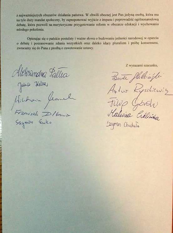 Dziesięć podpisów widnieje pod listem otwartym skierowanym do prezydenta Andrzej Dudy przez członków Rady Dzieci i Młodzieży przy Ministrze Edukacji Narodowej zawierającym apel o zawetowanie ustawy zmieniającej system oświatowy. Swój podpis pod apelem złożył m.in. uczeń XIII LO w Szczecinie Artur Ryszkiewicz.