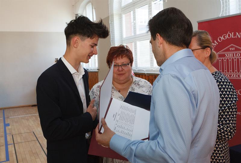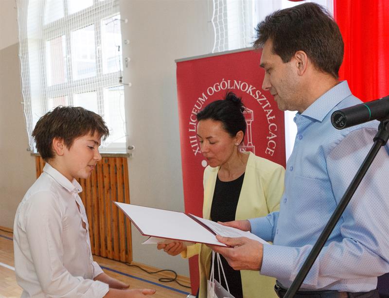 Uroczystość wręczenia dyplomów oraz nagród laureatom i finalistom konkursów organizowanych przez XIII Liceum Ogólnokształcące w Szczecinie odbyła się w poniedziałek w auli tej szkoły. Nagrody wręczał dyrektor Cezary Urban oraz nauczyciele przedmiotów konkursowych. Od kilkunastu lat uczniowie szkół podstawowych licznie uczestniczą w pięciu konkursach przedmiotowych XIII LO, gdyż oprócz satysfakcji i prestiżu, dają one laureatom wolny wstęp do "trzynastki", a finalistom - dodatkowe punkty w rekrutacji. Najstarszym spośród nich jest Konkurs Matematyczny, którego w tym roku odbyła się XIX edycja. Ponadto w tym roku odbyły się XVIII Konkurs Humanistyczny, XI Konkurs Historyczny, VI Konkurs Przyrodniczy i III Konkurs Biologiczny. Konkursy zostały objęte patronatem zachodniopomorskiego kuratora oświaty. ©℗