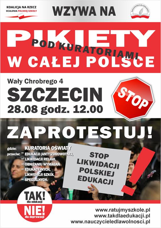 Koalicja na Rzecz Ocalenia Polskiej Szkoły organizuje serię pikiet pod kuratoriami oświaty w całym kraju, aby wyrazić swój sprzeciw wobec wprowadzenia przedmiotu edukacja zdrowotna i innym planom resortu edukacji. Jedna z pikiet odbędzie się również w Szczecinie.