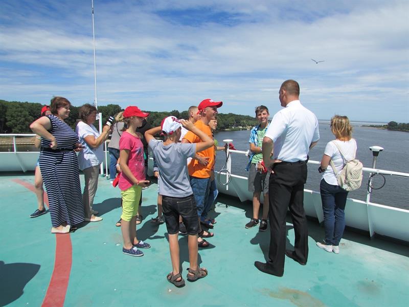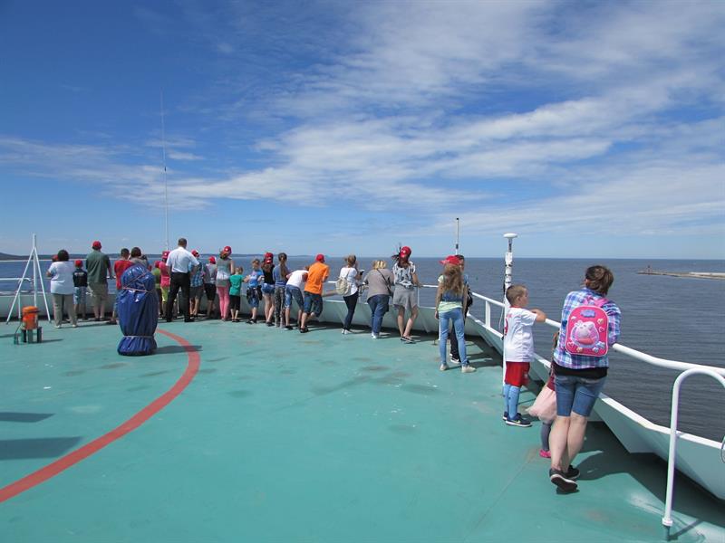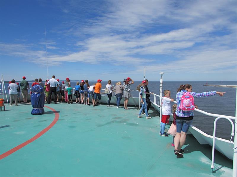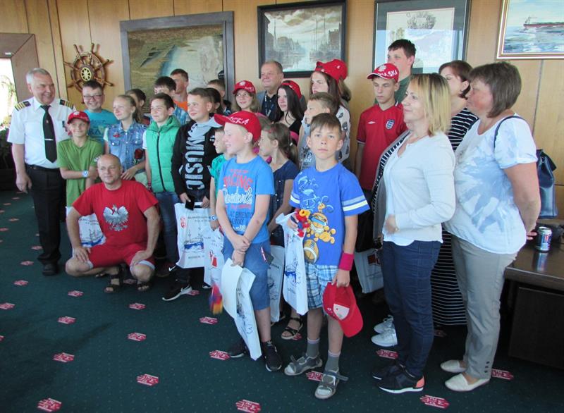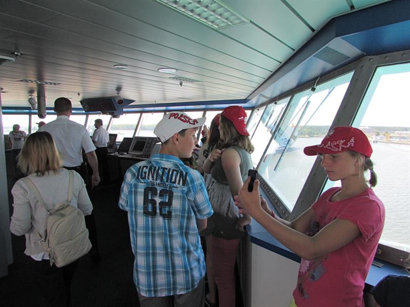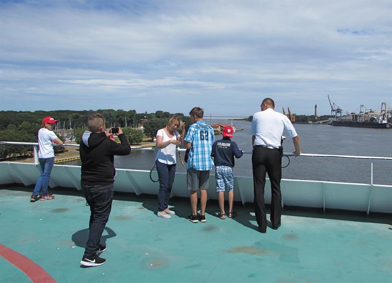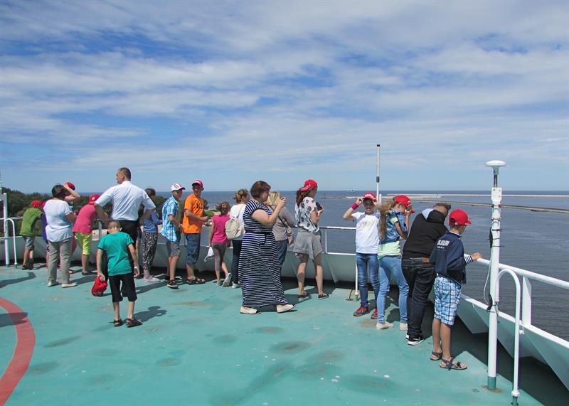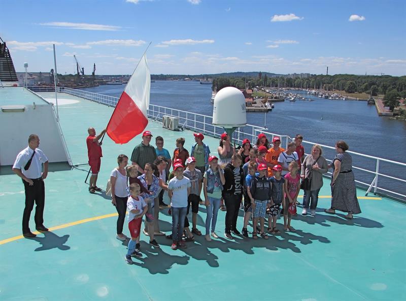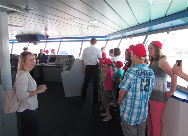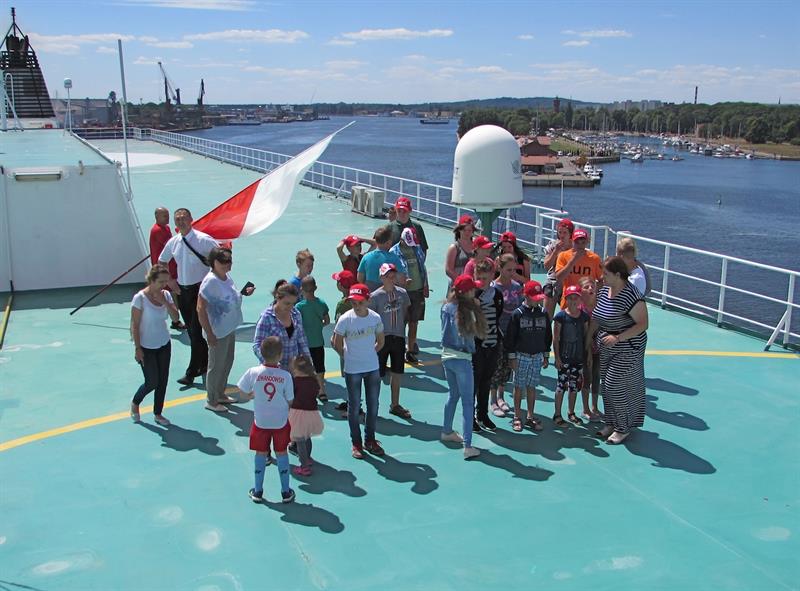Przedstawiciele załogi promu oprowadzili grupę po jednostce. Miała okazję wejść na mostek kapitański oraz zobaczyć, co kryje maszynownia statku. W sali konferencyjnej przygotowano dla dzieci szereg zabaw, m.in. plastycznych.