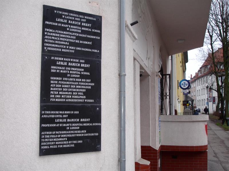 Koszalin pamięta o urodzonym nad Dzierżęcinką nobliście. Na ścianie kamienicy przy ulicy Dworcowej, gdzie na trzecim piętrze spędził dzieciństwo późniejszy naukowiec, 14 lipca 2005 roku została odsłonięta pamiątkowa tablica jemu poświęcona z notą w trzech językach. Gość z Londynu uczestniczył w tej uroczystości, a także w oficjalnym otwarciu starego cmentarza żydowskiego przy ulicy Rzecznej, gdzie pochowani są przodkowie prof. Leslie Brenta, w tym jego dziadek. ©℗