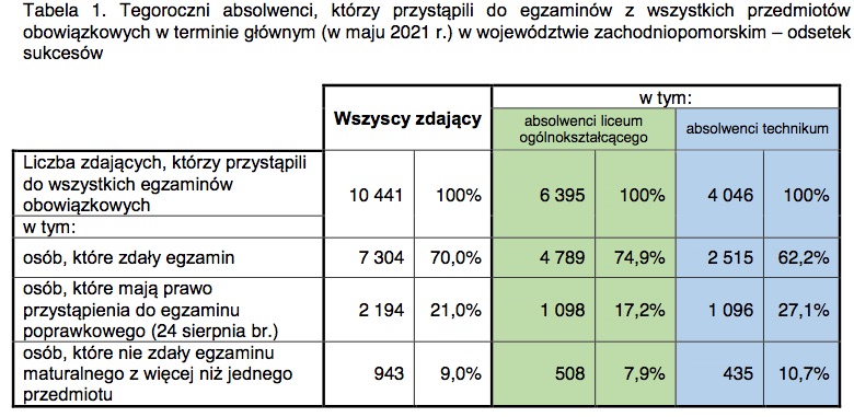 Wiadomo już, że to młodzież ze Szczecina i Koszalina ma najlepsze wyniki – 78 proc. zdawalności w odniesieniu do całego egzaminu, dobrze poszło też maturzystom ze Świnoujścia (75 proc.). Najgorzej wypadli absolwenci szkół ponadgimnazjalnych z powiatu kamieńskiego – tu wynik zdawalności ze wszystkich przedmiotów był na poziomie 44 procent.
