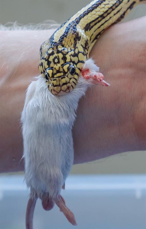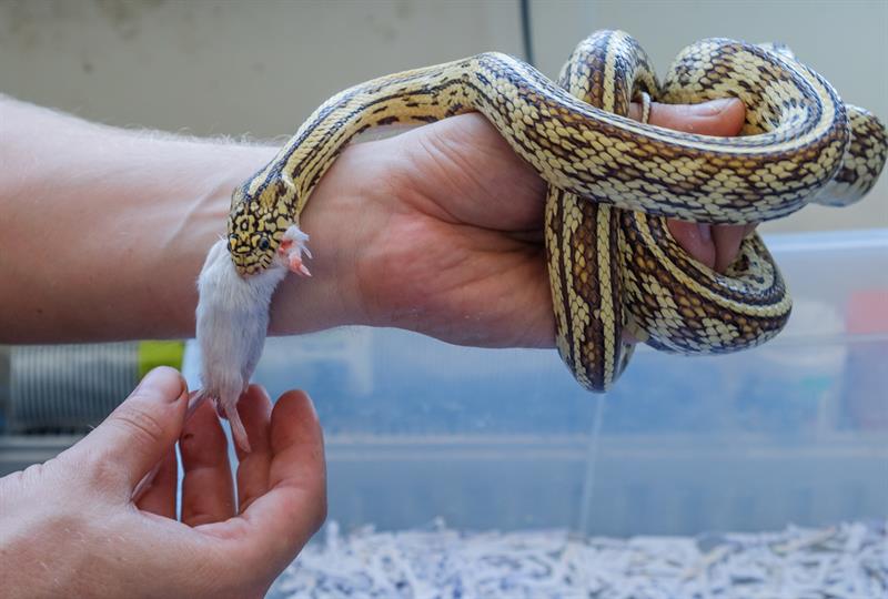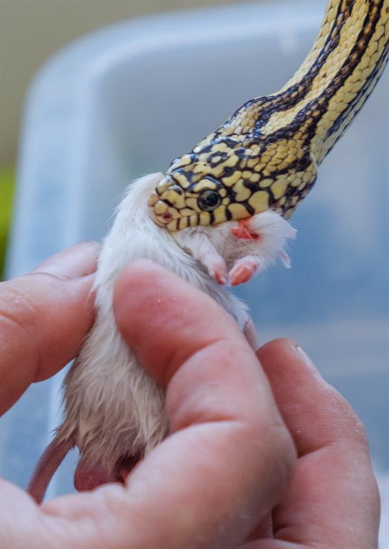 – Żywią się rozmrożonymi gryzoniami. Karmienie żywymi jest poważnym błędem pielęgnacyjnym i w wielu krajach jest zakazane jako skrajnie niehumanitarne. Gryzonie mogą nam też węża poranić albo zabić. Jeśli trafi się wąż, który nie chce jeść, możemy spróbować najpierw ze świeżo zabitym gryzoniem. Możemy również podać mrożonego, ale natartego zapachem świeżego. Można podawać pisklęta drobiu, ale tylko jako pokarm uzupełniający. Wybredniejszym gadom podaje się myszoskoczki czy noworodki królicze.