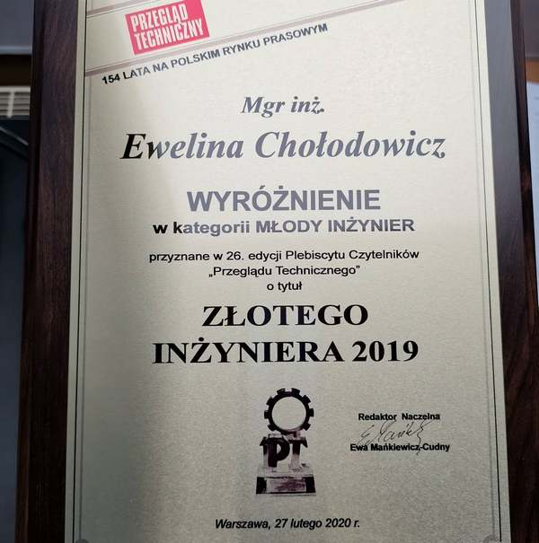 Ewelina Chołodowicz z Wydziału Elektrycznego Zachodniopomorskiego Uniwersytetu Technologicznego w Szczecinie wygrała w plebiscycie „Złoty Inżynier Przeglądu Technicznego” w kategorii „Młody Inżynier”.