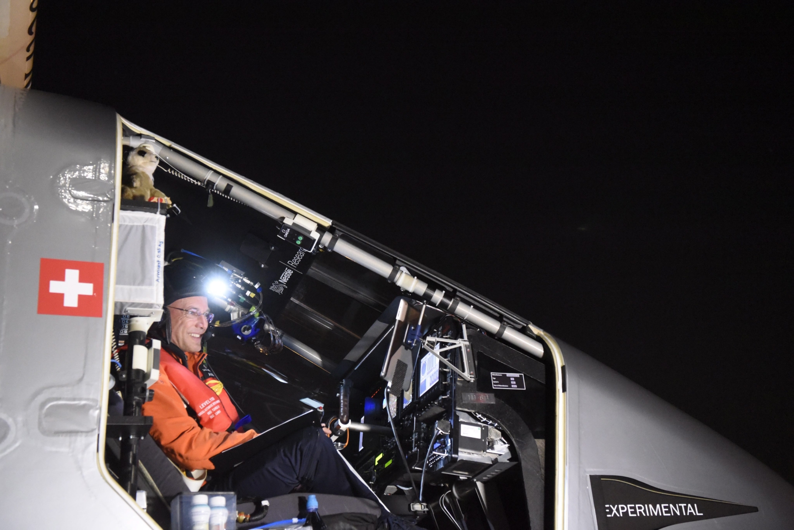 Na zdjęciu: Pilot Bertrand Piccard tuż przed startem