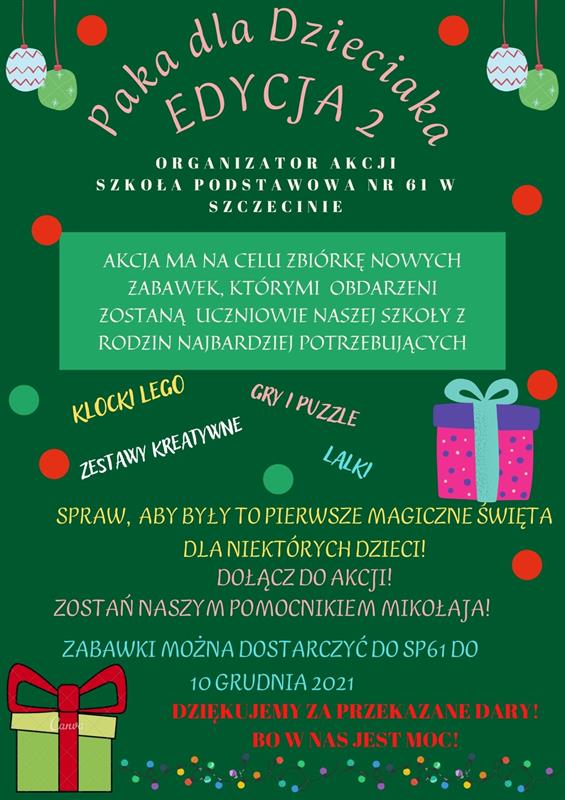 Grudzień to miesiąc dla wielu wyjątkowy i magiczny, szczególnie dla najmłodszych, piszących listy do Św. Mikołaja, ale nie dla wszystkich... Są rodziny, które nie są w stanie spełniać pragnień swoich pociech. Dlatego Szkoła Podstawowa nr 61 w Szczecinie już po raz drugi stara się, dzięki hojnym darczyńcom, obdarować najbardziej potrzebujących uczniów paczką pod choinkę.