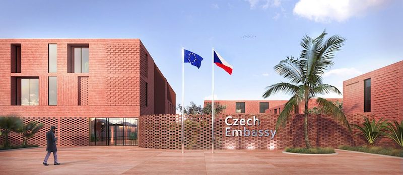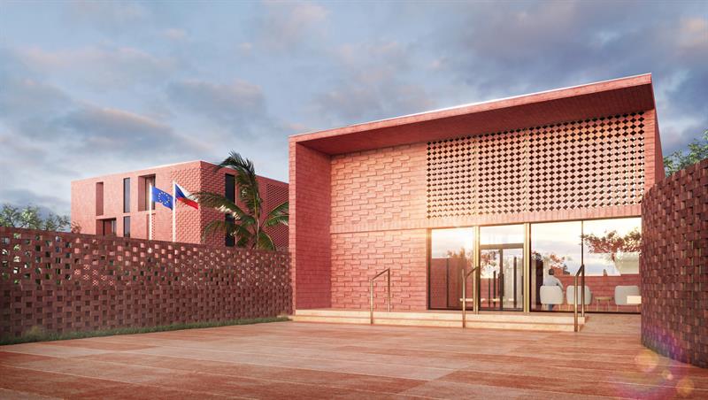 Inspiracją do powstania projektu stał się symbol Republiki Czeskiej – liść lipy. Obrys liścia został przetworzony w formy ceramicznych kształtek. Całość budynku zaprojektowano w kolorystyce inspirowanej laterytem - lokalną skałą osadową, która jest charakterystyczna dla rejonów o wilgotnym i gorącym klimacie.
