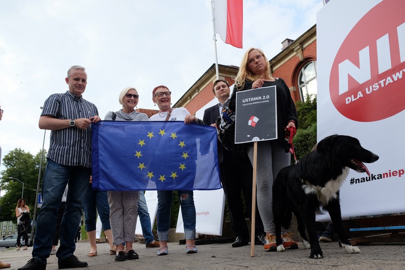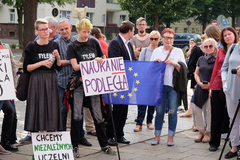 Nie - dla centralizacji szkolnictwa wyższego. Tak - dla współpracy między uczelniami. Nie - dla Programu 2.0. Tak - dla 2 proc. PKB na uczelnie. Takie hasła padały na piątkowym (15 czerwca) proteście Uniwersytetu Szczecińskiego przed rektoratem uczelni. Zgromadził on 60-80 pracowników i studentów US. W trakcie dołączyła też kilkuosobowa grupka studentów Akademii Sztuki.