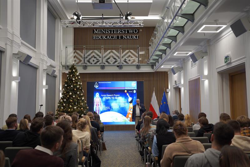 Przedstawiciele największych agencji kosmicznych spotkali się w Ministerstwie Edukacji i Nauki z polskimi studentami. Wydarzenie odbyło się przy okazji posiedzenia ISLSWG (International Space Life Science Working Group).