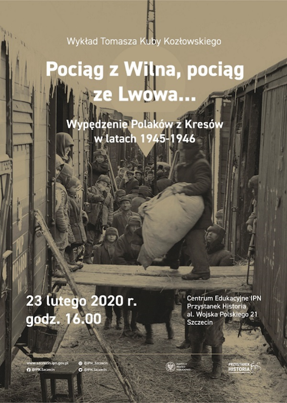 W niedzielę o g. 16 w Centrum Edukacyjnym Instytutu Pamięci Narodowej "Przystanek Historia" przy al. Wojska Polskiego 21 w Szczecinie rozpocznie się wykład zatytułowany "Pociąg z Wilna, pociąg ze Lwowa… Wypędzenie Polaków z Kresów w latach 1945 - 1946". Wygłosi go Tomasz Kuba Kozłowski z Domu Spotkań z Historią.
