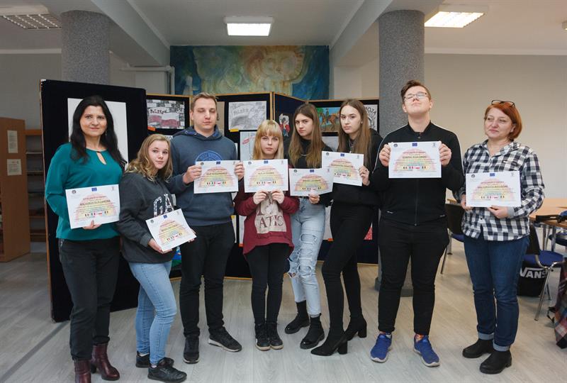 Na zdjęciu: Uczniowie i nauczycielki z certyfikatami udziału w projekcie Erasmus+ w Rumunii