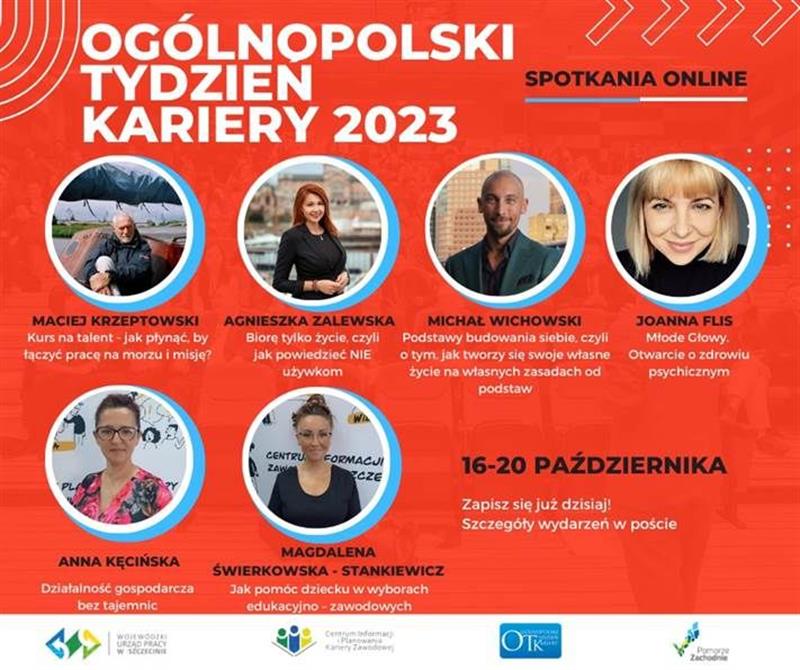 Lista tegorocznych prelegentów jest imponująca. Gościem specjalnym Tygodnia Kariery jest kapitan Maciej Krzeptowski, żeglarz, laureat nagrody im. Leonida Teligi, autor książki „Trzymam się morza”. Jego wykład "Kurs na morze" to opowieść o tym, jak łączyć prace na morzu z pasją. Doradcy z Centrum Informacji i Planowania Kariery Zawodowej zaprosili również Michała Wichowskiego - mówcę motywacyjnego, twórcę nowoczesnej platformy i agencji dla freelancerów FREEDOM, który przybliży młodzieży podstawy budowania siebie, własnej kariery, całego życia. Agnieszka Zalewska, specjalistka z zakresu edukacji i profilaktyki przeciwdziałania uzależnieniom z Polskiej Fundacji Przeciwdziałania Uzależnieniom zwróci uwagę, jak powiedzieć "nie" wszelkim używkom, gdzie szukać wsparcia i pomocy. Z kolei Joanna Flis - psycholożka i specjalistka psychoterapii uzależnień i współuzależnienia, współautorka raportu „MŁODE GŁOWY" pokaże jak ważna jest idea niesienia pomocy i wsparcia dla rodzin oraz najbliższego otoczenia młodzieży objętej kryzysem a także wzmocni poczucie wartości u nastolatków. Spotkanie z doradcą kariery Anną Kęcińską jest natomiast dla tych, którzy mają apetyt na własny biznes. Z webinaru dowiedzą się, jak przejść wszelkie procedury związane z założeniem działalności gospodarczej, omówione zostaną także zagadnienia rachunkowe łącznie z tymi które dotyczą rozliczeń z urzędami skarbowymi i ZUS. Młody człowiek na starcie swojego biznesu dowie się, jak i gdzie sięgnąć po środki finansowe oferowane przez różne instytucje województwa zachodniopomorskiego, zajmujące się promocją przedsiębiorczości.
