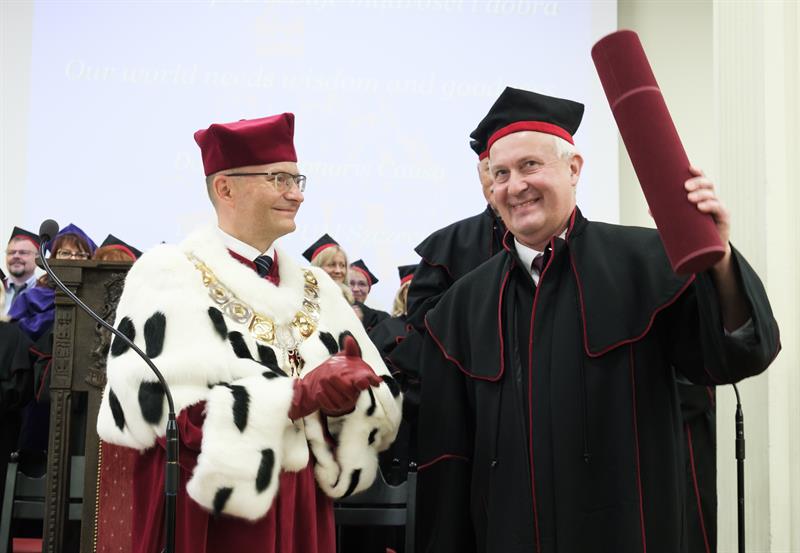 Prof. Jan Lubiński (z prawej) podczas uroczystości nadania mu tytułu doktora honoris causa. Obok niego prof. Bogusław Machaliński, rektor PUM. Fot. Dariusz Gorajski