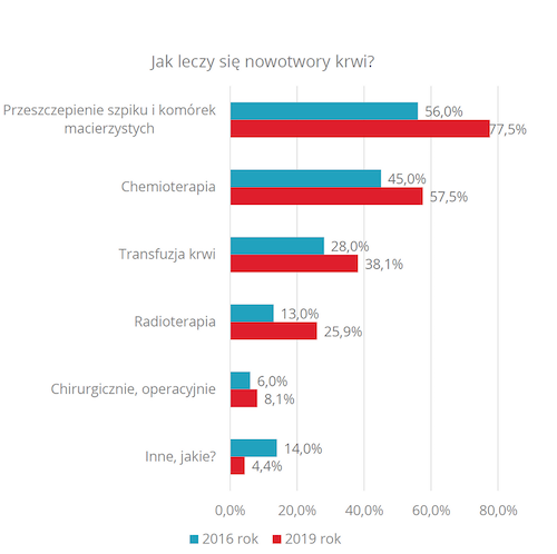 Ponad połowa ankietowanych była zdania, że nowotwory krwi są uleczalne, zależy to jednak od wielu czynników. Wysoka okazała się także znajomość metod leczenia tych nowotworów. Ponad 3/4 badanych wskazało, że jedną z metod leczenia jest przeszczepienie szpiku (w 2016 roku było to tylko 56 proc.), a ponad połowa wskazała na chemioterapię. Optymizmem napawa też fakt, że błędną odpowiedź, jaką jest leczenie operacyjne, wybrał najmniejszy odsetek respondentów – 8,1 proc. Jednostkowe okazały się także wskazania na niebezpieczne próby leczenia nowotworów krwi, czyli metody niekonwencjonalne, takie jak zioła czy dieta bogata w antyoksydanty. A co z profilaktyką? Chociaż ponad połowa badanych wiedziała, że nowotwory krwi można wykryć dzięki badaniu krwi, to niepokój wzbudza fakt, że aż 133 osoby (na 1000) nie wiedziały w ogóle jak to zrobić. Odpowiedzi pokazują, jak ważne jest prowadzenie działań edukacyjnych na temat profilaktyki tych nowotworów. Zwłaszcza, że jest to choroba „niezawiniona” – dotyka także osoby, które dbają o zdrowie i unikają używek.