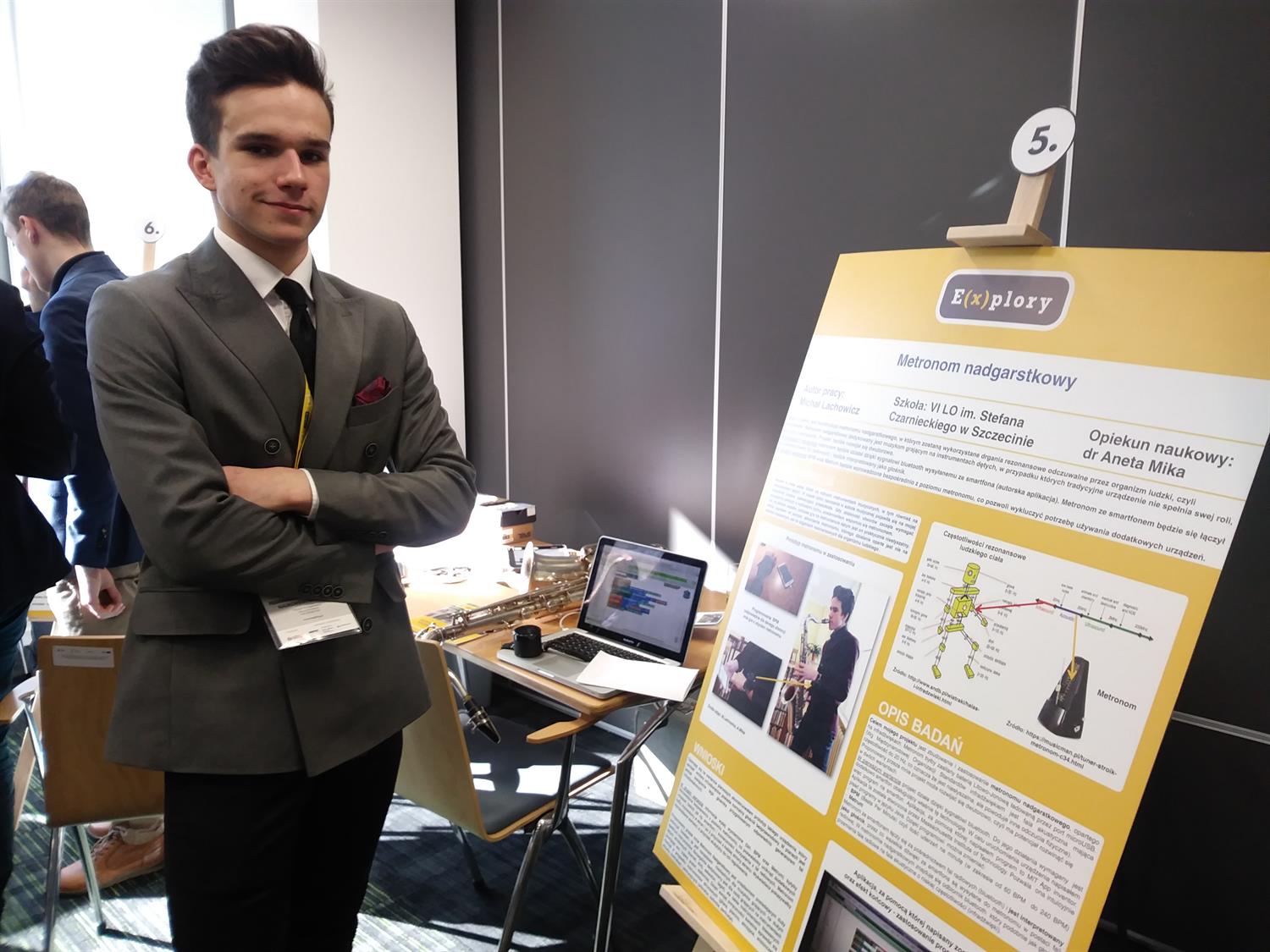 Michał Lachowicz z VI Liceum Ogólnokształcącego w Szczecinie zaprojektował pod kierunkiem nauczycielki Anety Miki metronom nadgarstkowy. - Normalny metronom (wystukujący prawidłowy rytym - dop. red.) w przypadku głośnych instrumentów jest niesłyszalny. Wykorzystując najnowszą technologię możemy odczytać częstotliwość dźwiękku na nadgarstku, gdyż to urządzenie wykorzystuje zjawisko przewodnictwa kostnego - wyjaśniał Michał. - Uczę się w szkole muzycznej i kiedyś nauczyciel wystukiwał mi rytm nogą, dźwięk przechodził po podłodze i ja go czułem. Tak powstał pomysł.