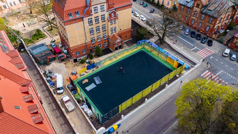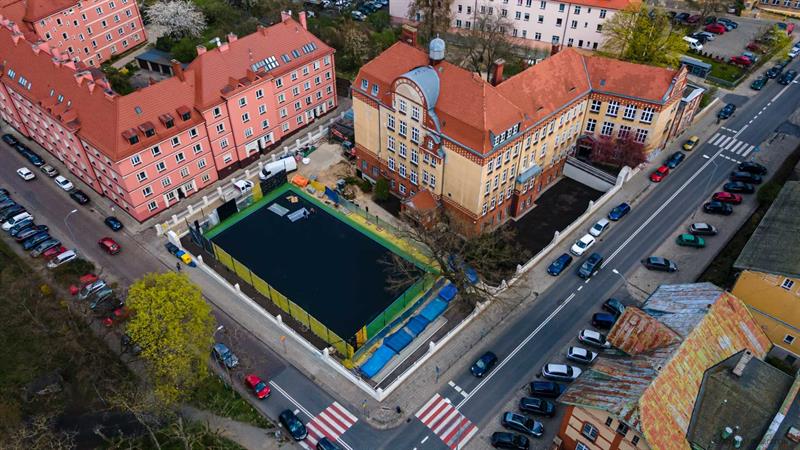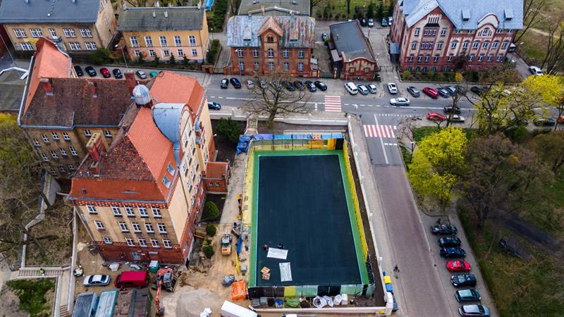 Nowe wielofunkcyjne boisko powstaje przy VI Liceum Ogólnokształcącym przy ul. Jagiellońskiej w Szczecinie. Widać już jego zarys. Trwają prace przy zagospodarowaniu terenu.