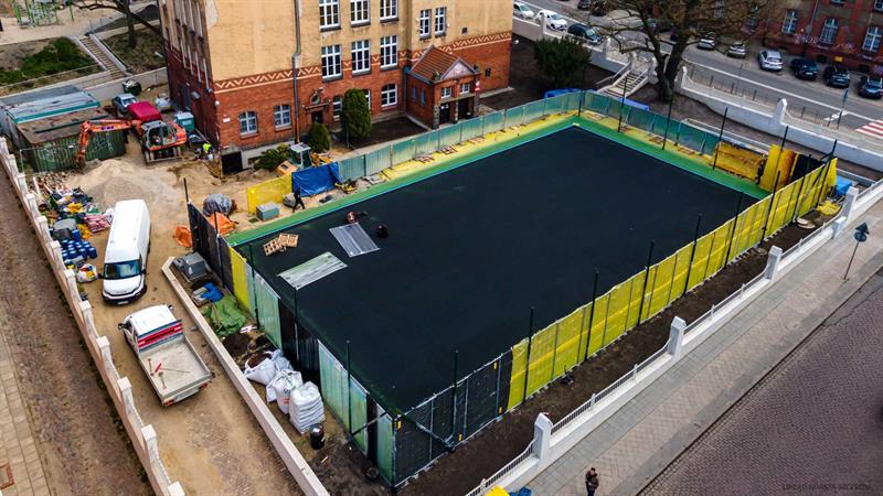 Prace obejmują: wykonanie wielofunkcyjnego boiska wraz ze słupkami i osprzętem do siatkówki, koszyków i piłki ręcznej; wykonanie odwodnienia liniowego boiska; montaż słupów oświetleniowych, wykonanie piłkochwytów; wykonanie dojść i placu z kostki betonowej, montaż ławek; wykonanie siłowni zewnętrznej; zagospodarowanie zieleni. W zakres robót wchodzi też wykonanie izolacji ścian fundamentowych budynku szkoły. Prace zakończą się w tym roku. Koszt to ponad 3,2 mln zł. Inwestycję nadzoruje Wydział Inwestycji Miejskich Urzędu Miasta Szczecin.