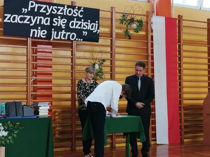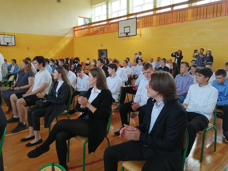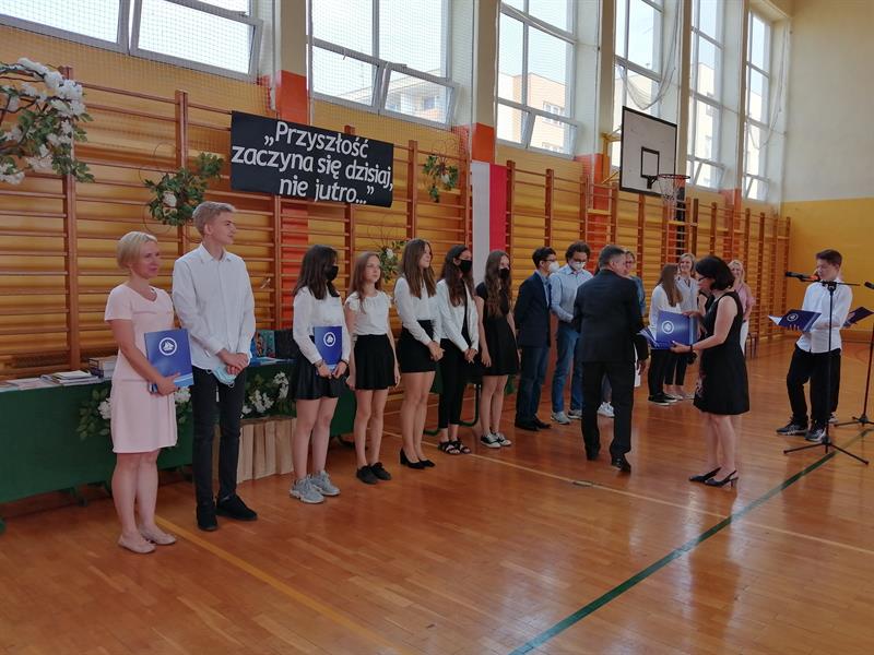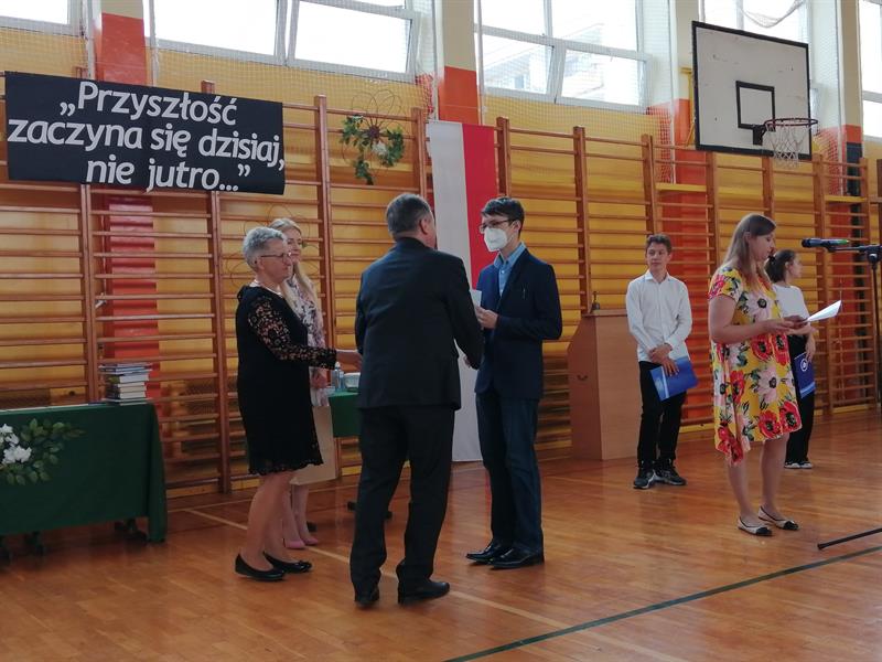 Uczniowie odbierali także nagrody za sukcesy w konkursach matematycznych, fizycznych, języków obcych, wosu i historii. Ponad 20 osób z pięciu klas z ósmych zostało wpisanych do Złotej księgi absolwentów. - Wielu z was już wybrało swoje przyszłe szkoły, jednak wyniki egzaminu ósmoklasisty nie są wam jeszcze znane. W tym roku z powodu pandemii, egzamin odbył się dopiero pod koniec maja i jego wstępne wyniki poznacie drugiego lipca, a szczegółowe będą znane dziewiątego lipca - wyjaśniał dyrektor Janusz Cymerman, który życzył swoim wychowankom sukcesów w rekrutacji oraz dalszej nauce w szkołach średnich.