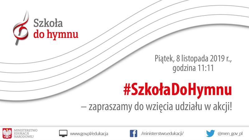 Do wspólnego odśpiewania Hymnu Polski w piątek (8 listopada) zachęca wszystkie szkoły, przedszkola i placówki oświaty minister edukacji. Z okazji nadchodzącego Święta Niepodległości MEN wraz z Radą Dzieci i Młodzieży organizuje wielką akcję „Szkoła do hymnu”.