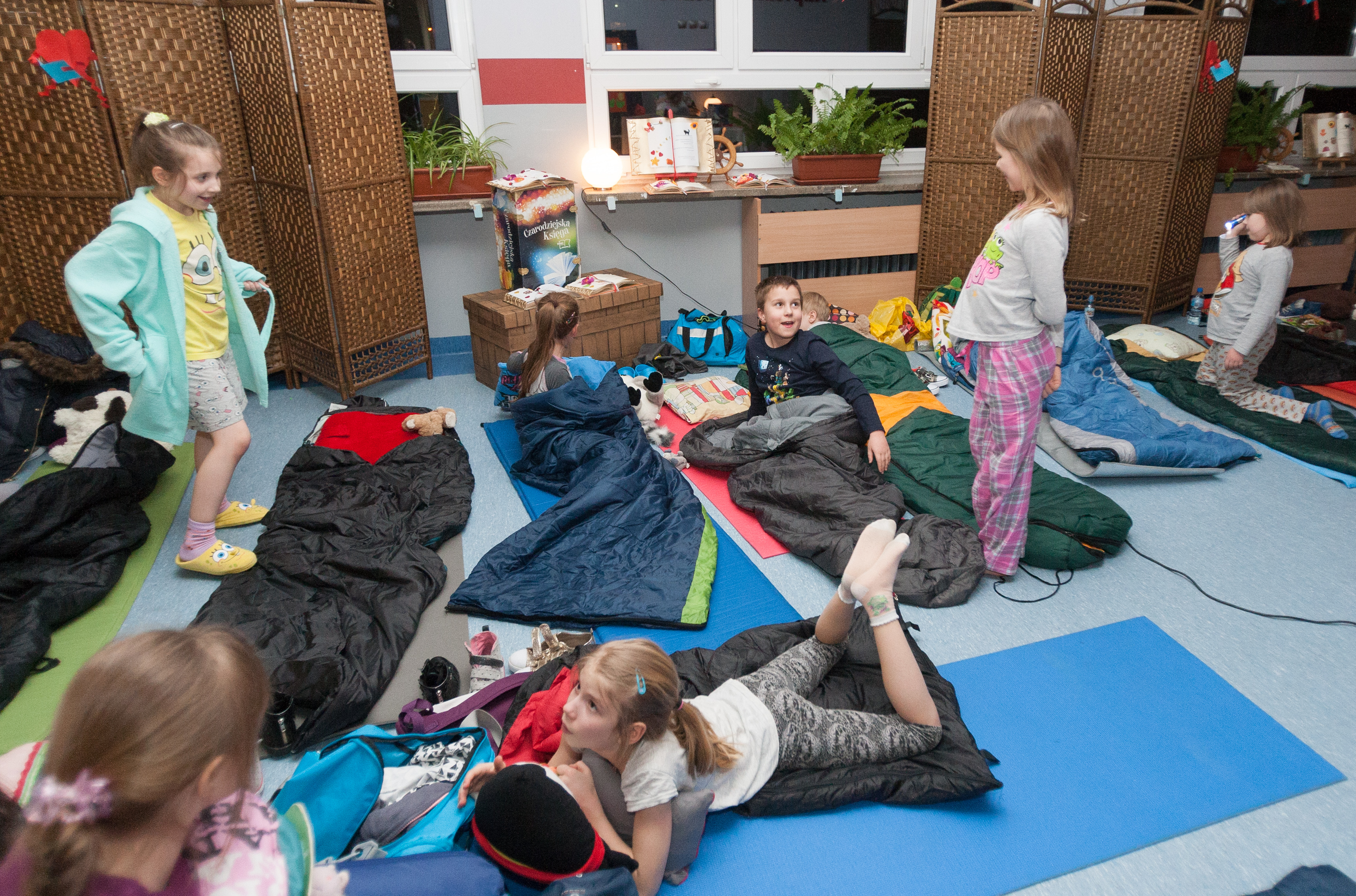 Śpiwór, poduszka, piżama, kapcie, szczoteczka do zębów, pasta, ręcznik, ulubiona "książka do poduszki" - oto ekwipunek, jaki przynieśli ze sobą uczniowie ze szczecińskiej Szkoły Podstawowej nr 56, którzy w piątkowe popołudnie pojawili się w tutejszej bibliotece. Dzieci pozostały tu potem przez ... całą noc, w ramach akcji "Zakochani w czytaniu". Było zatem czytanie baśni z podziałem na role, śpiewanie piosenek przy akompaniamencie gitary, zajęcia plastyczne, kolacja na stołówce, no i nocleg w szkolnej bibliotece.