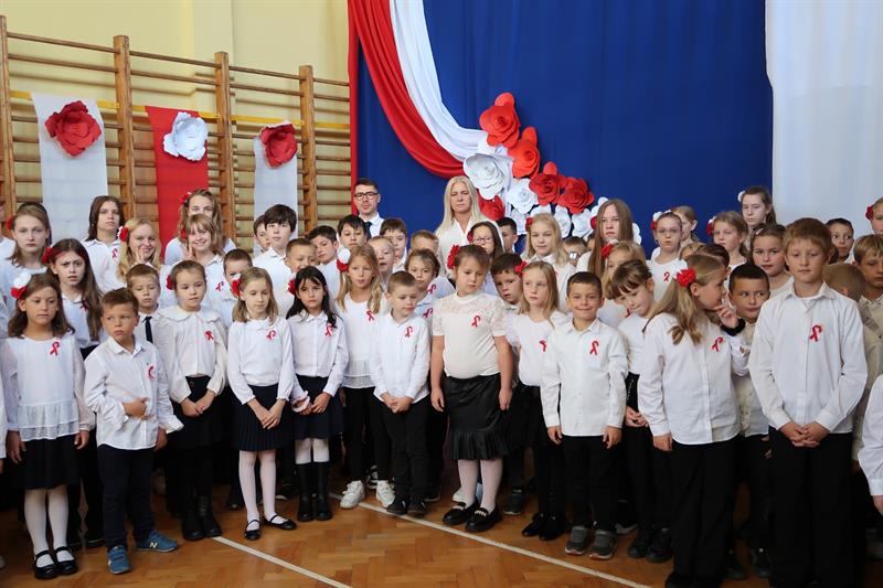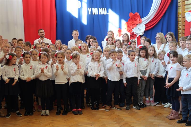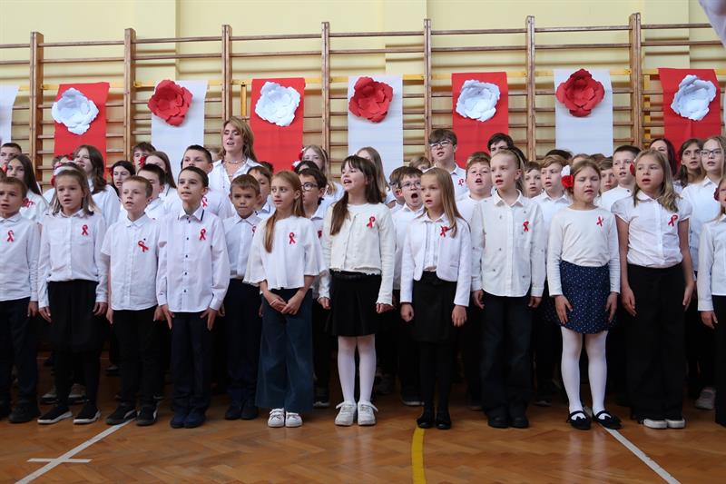 - Oprócz Mazurka Dąbrowskiego nasze dzieci wykonały także "Pieśń Powstańców 1863 roku" oraz "Rotę" - mówi nauczycielka. - Bardzo się cieszymy, że udało się nam zaangażować niemal wszystkich uczniów w szkole, a także całe grono pedagogiczne - od pani dyrektor po wychowawców. Frekwencja była wspaniała - z 233 uczniów patriotyczne pieśni zaśpiewało 98 procent dzieci i nastolatków. W konkursie właśnie o to chodzi, by rozśpiewać uczniów, aby wykonania pieśni podjęły się wszystkie, niezależnie od predyspozycji wokalnych. Galowo ubranie dzieci ze specjalnie na tę okazję przygotowanymi w szkole kotylionami zaprezentowały się wspaniale.