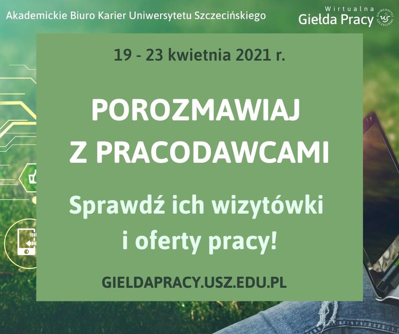 Dziewiętnastego kwietnia Akademickie Biuro Karier Uniwersytetu Szczecińskiego organizuje kolejną edycję Wirtualnej Giełdy Pracy. W tym roku zostanie zrealizowane pod hasłem Networking Week. Z powodu pandemii zaplanowane na cały tydzień - do 23 kwietnia - wydarzenie odbędzie się w formule online.