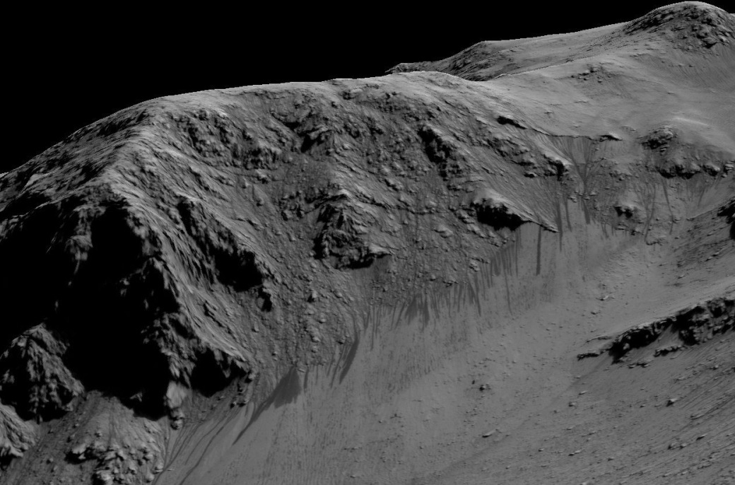 Na zdjęciu: Ciemne, wąskie smugi płynące z góry na Marsie