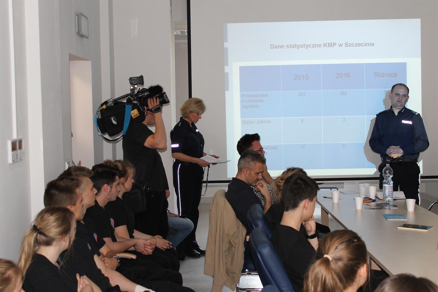 O zachowaniach przemocowych wśród rówieśników i odpowiedzialności karnej rozmawiali uczniowie dwóch klas o profilach: obronno-ratowniczym z Gimnazjum nr 18 oraz bezpieczeństwo publiczne z LO nr 7. Partnerami dla uczniów w tej dyskusji, poza policjantami: mł. insp. Andrzejem Biernatem, zastępcą komendanta KMP oraz nadkom. Katarzyną Legan i asp. Michałem Sroką z Wydziału Prewencji KMP, byli ich nauczyciele – Bogdan Dziewulski, dyrektor LO nr 7 i Robert Wypart z Gimnazjum nr 18, a także Michał Klimczak, psycholog z sekcji Interwencji Kryzysowej Miejskiego Ośrodka Pomocy Rodzinie. To kolejne takie spotkanie, ostatnie odbyło się w listopadzie i dotyczyło problemu przemocy w szerszym aspekcie.