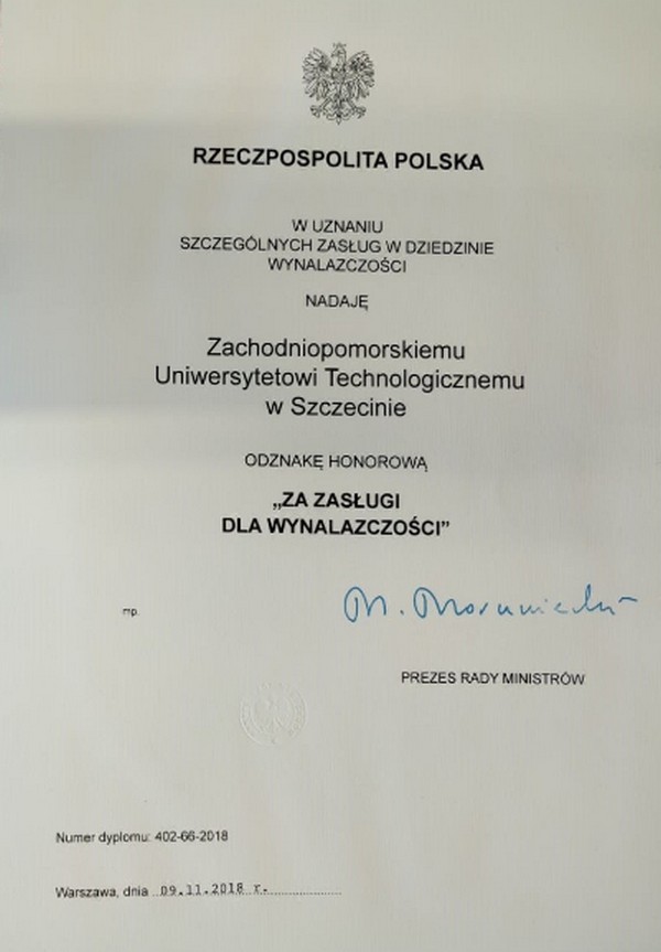 Zachodniopomorski Uniwersytet Technologiczny w Szczecinie jako jedna z dziewięciu polskich uczelni został wyróżniony odznaką honorową „Zasłużony dla Wynalazczości”. Wyróżnienie to przyznał premier Mateusz Morawiecki.