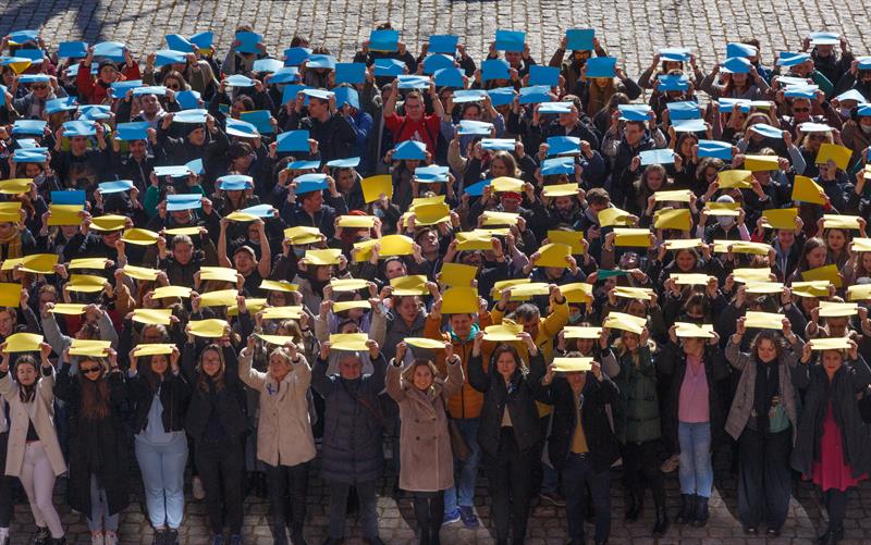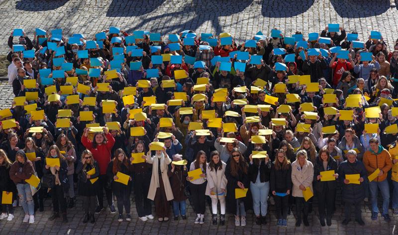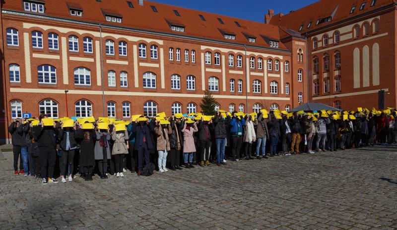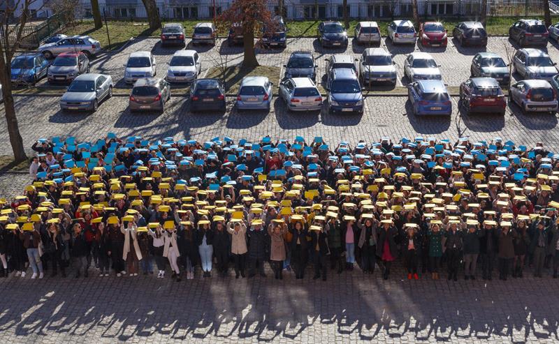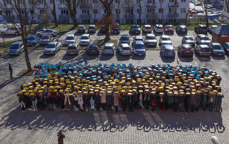Studenci i pracownicy Uniwersytetu Szczecińskiego na dziedzińcu kampusu w poniedziałek 7 marca przy al. Piastów utworzyli żywą, żółto - niebiesko flagę. To wyraz wsparcia społeczności największej uczelni w naszym regionie dla wschodnich sąsiadów Polski, zaatakowanych przez armię Władimira Putina. US angażuje się w pomoc Ukrainie od pierwszych dni inwazji, organizując m.in. kursy językowe.