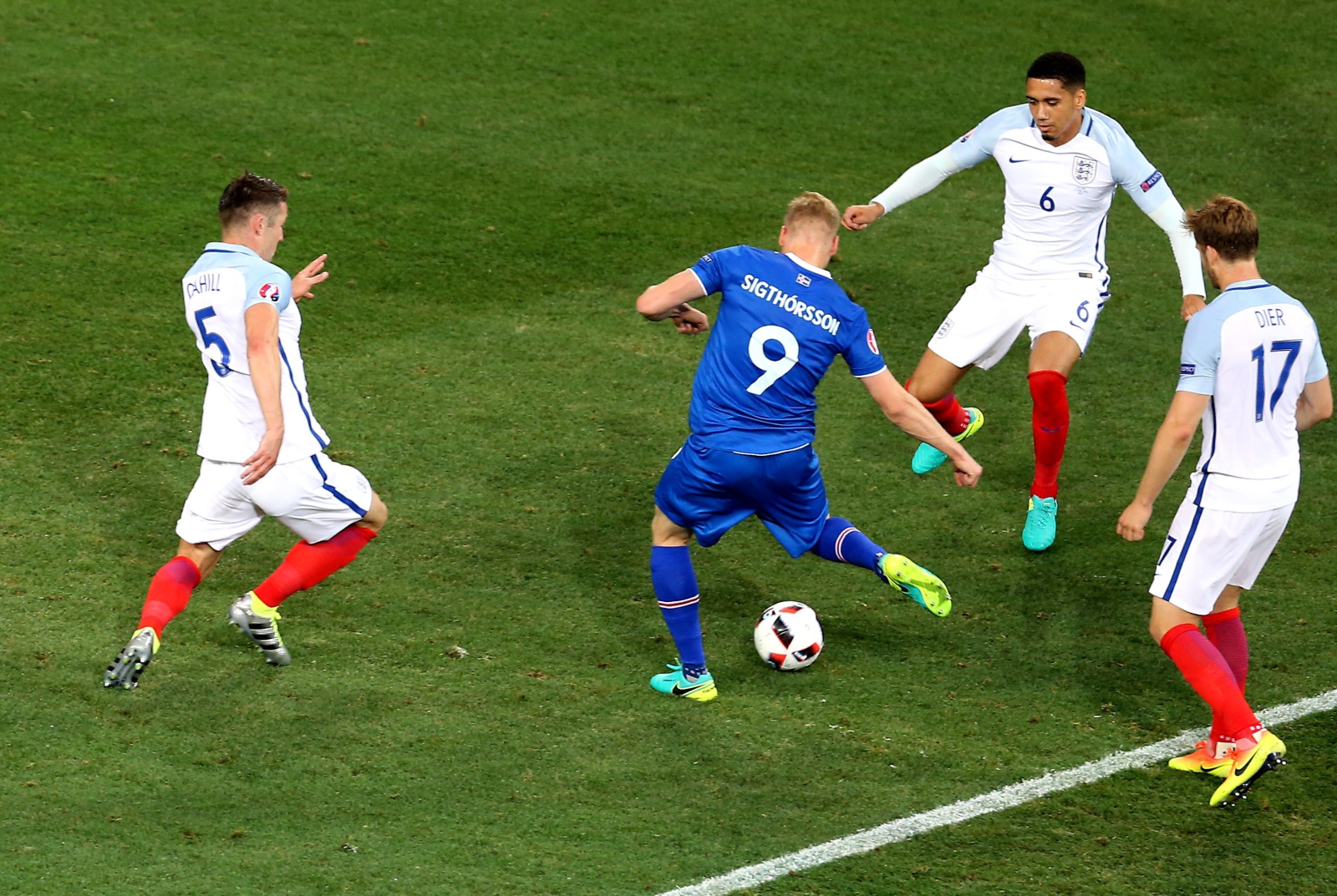 Na zdjęciu: Kolbeinn Sigthorsson strzela zwycięską bramkę dla Islandii mimo asysty trzech Anglików.