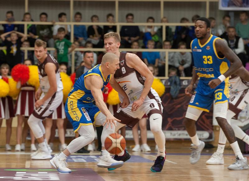 Pierwsza kwarta przebiegła pod dyktando Arki, która oddała cztery celne rzuty za trzy punkty. Spójnia nie miała w pierwszych minutach pomysłu na grę ofensywną i przegrywała już 11 punktami. Podopieczni trenera Winnickiego przebudzili się w drugiej odsłonie. Już na początku odpowiedzieli trzema "trójkami", a dzięki kombinacyjnej defensywie potrafili odrobić straty i wyjść na prowadzenie. Udane wejście na parkiet zaliczył Gintvainis rzucając w tej odsłonie 6 punktów. Udanymi akcjami popisywali się też Kostrzewski i Młynarski. 36 punkty zdobyte w drugiej kwarcie pozwoliły stargardzianom zejść na długą przerwę z przewagą ośmiu oczek.