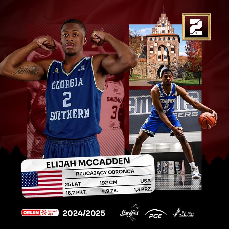 Nowy nabytek Spójni ma zastąpić w składzie gwiazdę Luthera Muhammada, który skorzystał z intratnej propozycji w Izraelu. Eljah McCadden swoją karierę akademicką w NCAA rozpoczął reprezentując Georgia Southern University, gdzie w trakcie czterech sezonów wystąpił w 115 meczach. W ostatnim sezonie notował średnio 11,7 punktu, 4,6 zbiórek oraz 2,6 asysty na mecz. Następnie kontynuował swój rozwój koszykarski w programie Memphis Tigers pod kierunkiem Penny’ego Hardawaya, reprezentując jedną z najbardziej prestiżowych uczelni koszykarskich w USA. Po zakończeniu kariery akademickiej McCadden występował również w lidze letniej NBA, reprezentując Philadelphia 76ers. Kolejnym etapem jego kariery była gra w Europie – w sezonie 2023/2024 występował w portugalskiej lidze, reprezentując Portimonense Viva Portimão, gdzie notował średnio 12,7 punktu, 3 zbiórki oraz 0,9 asysty na mecz. W sezonie 2024/2025 kontynuował karierę w Portugalii, występując dla Galitos Barreiro i osiągając średnio 18,7 punktu, 4,9 zbiórek oraz 2,3 asysty na mecz. Teraz Elijah McCadden dołączył do Spójni, a sztab szkoleniowy klubu liczy, że jego atletyzm i umiejętności snajperskie pozwolą jeszcze stargardzkiemu zespołowi włączyć się do walki o play-off.