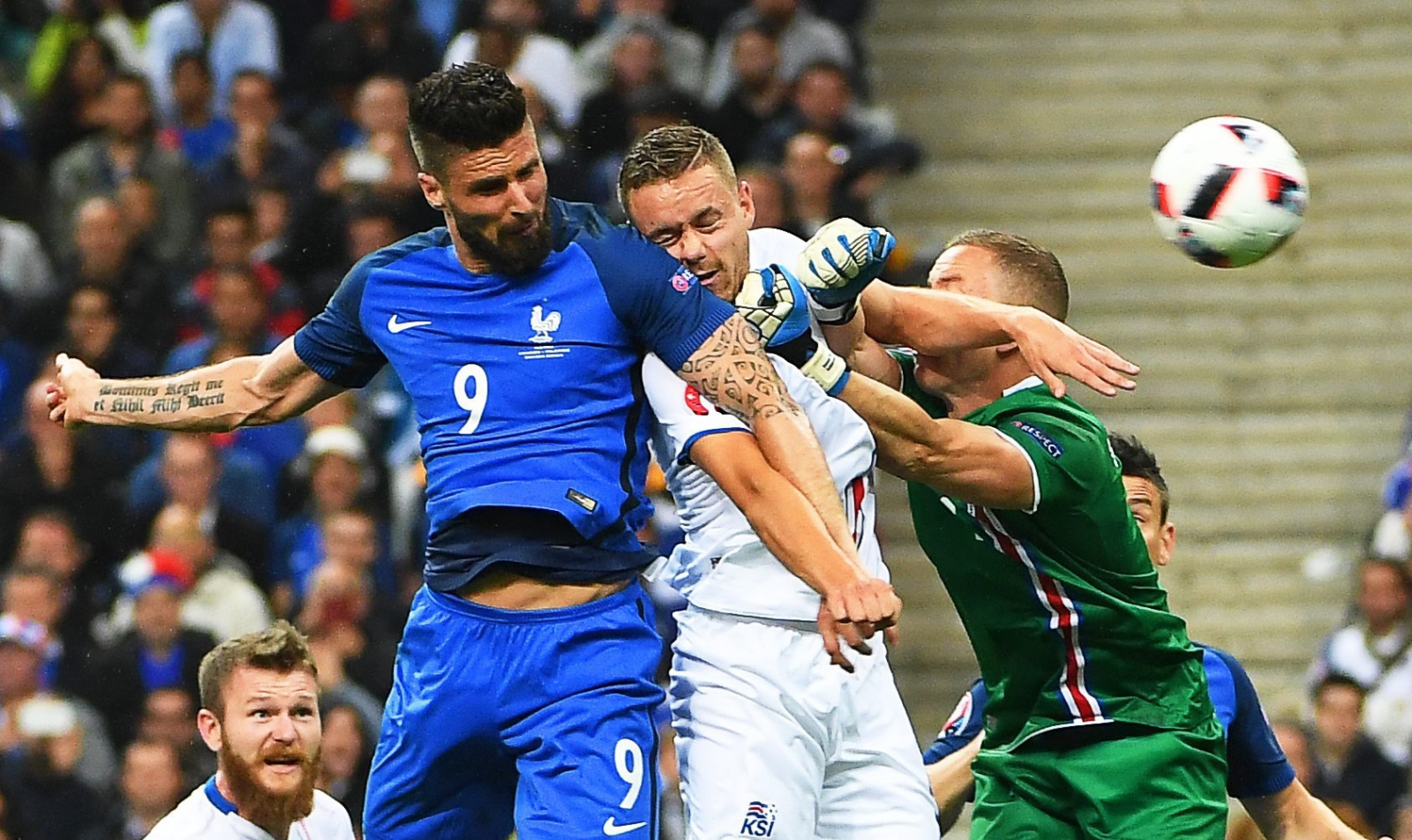 Na zdjęciu: Olivier Giroud strzela głową swoją drugą bramkę w meczu Francuzów z Islandczykami na 5:1.