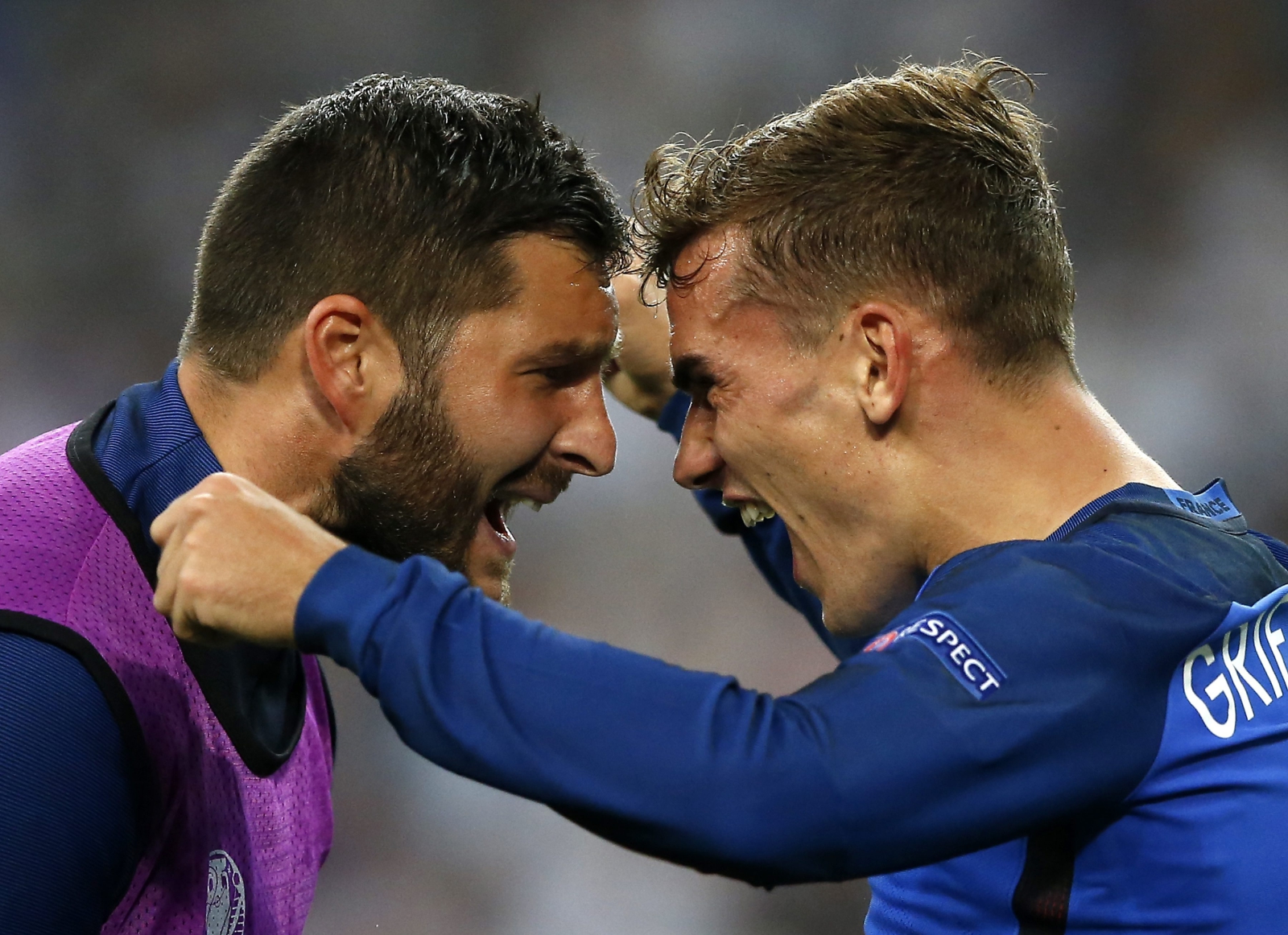 Na zdjęciu: Antoine Griezman (z prawej) po strzeleniu swojego szóstego gola w turnieju i drugiego w meczu z Niemcami cieszy się z wyniku i Andre-Pierre Gignac.