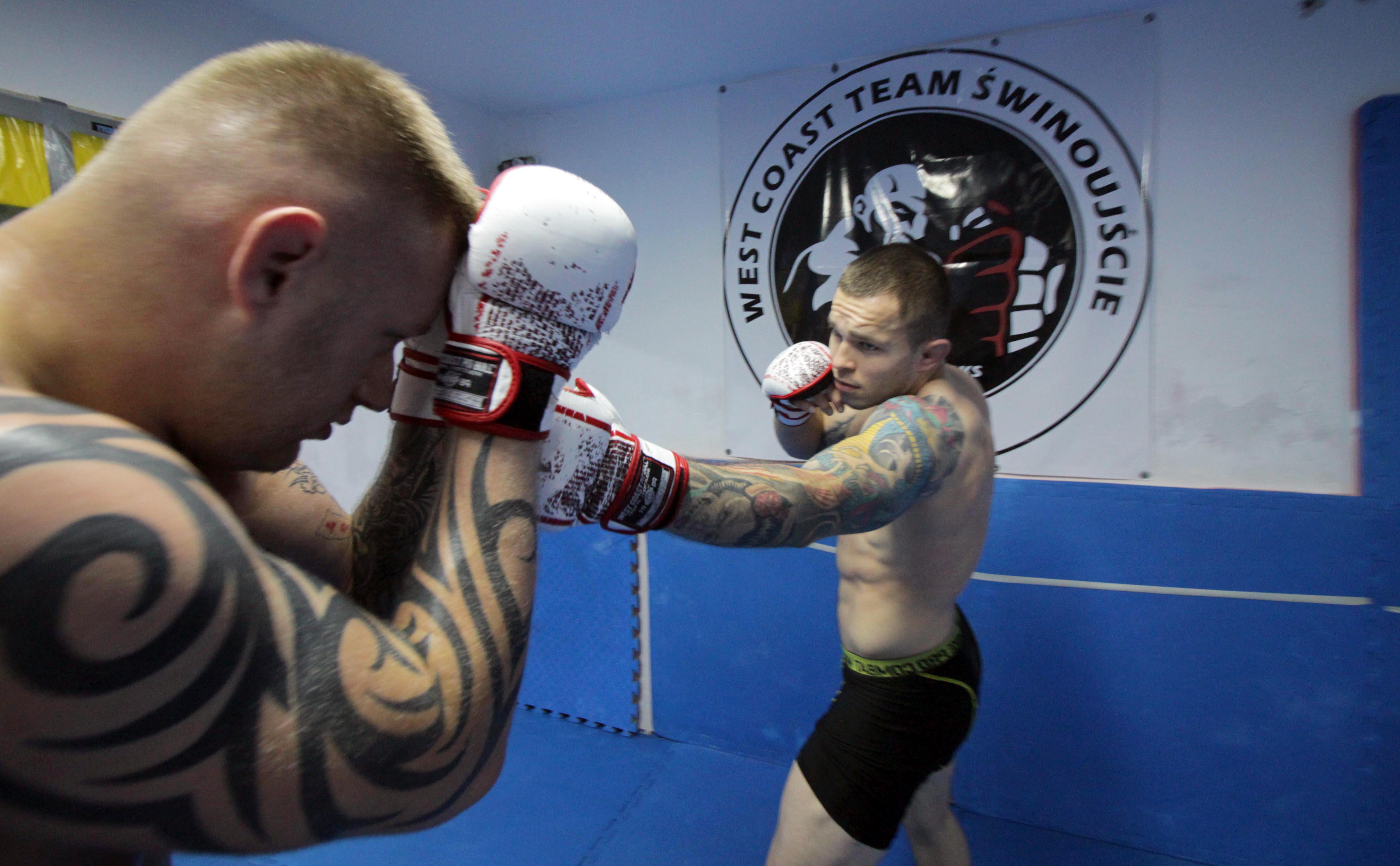 Na zdjęciu: Adam Lewandowski podczas porannego sparingu w sali West Coast Team z trenerem Marcinem Rąblem. Bazowym stylem fightera ze Świnoujścia jest brazylijskie jiu jitsu, w którym posiada brązowy pas oraz zapasy, ale szlifuje też stójkę. Do tej pory wygrał sześć spośród sześciu walk, a tylko jedną przegrał. Ma też sporo tryumfów na zawodach brazylijskiego jiu jitsu oraz submission fighting.