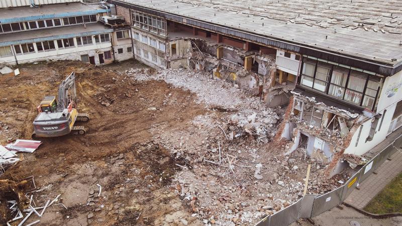 Po tygodniach przygotowań na dobre rozpoczęły się prace demontażowe oraz rozbiórkowe SDS-u. Przygotowano zaplecze budowy, wygrodzono teren, przeprowadzono demontaż pomniejszych elementów budynku m.in. paneli fotowoltaicznych znajdujących się na dachu i teraz przy użyciu ciężkiego sprzętu rozpoczęto faktyczne wyburzanie obiektu. W stertę gruzu obróciła się już jedna ze ścian hali sportowej. Etap rozbiórek potrwa kilka najbliższych tygodni. Po nich przyjdzie czas na przygotowanie terenu inwestycji pod budowę nowego kompleksu.