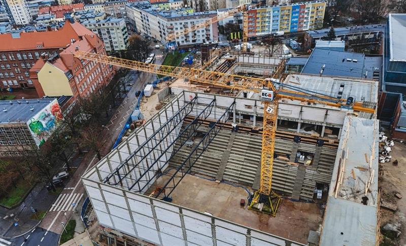 Siedem stalowych dźwigarów stanowić będzie trzon konstrukcji dachu nowej hali sportowej Szczecińskiego Domu Sportu i właśnie trwa ich montaż.
