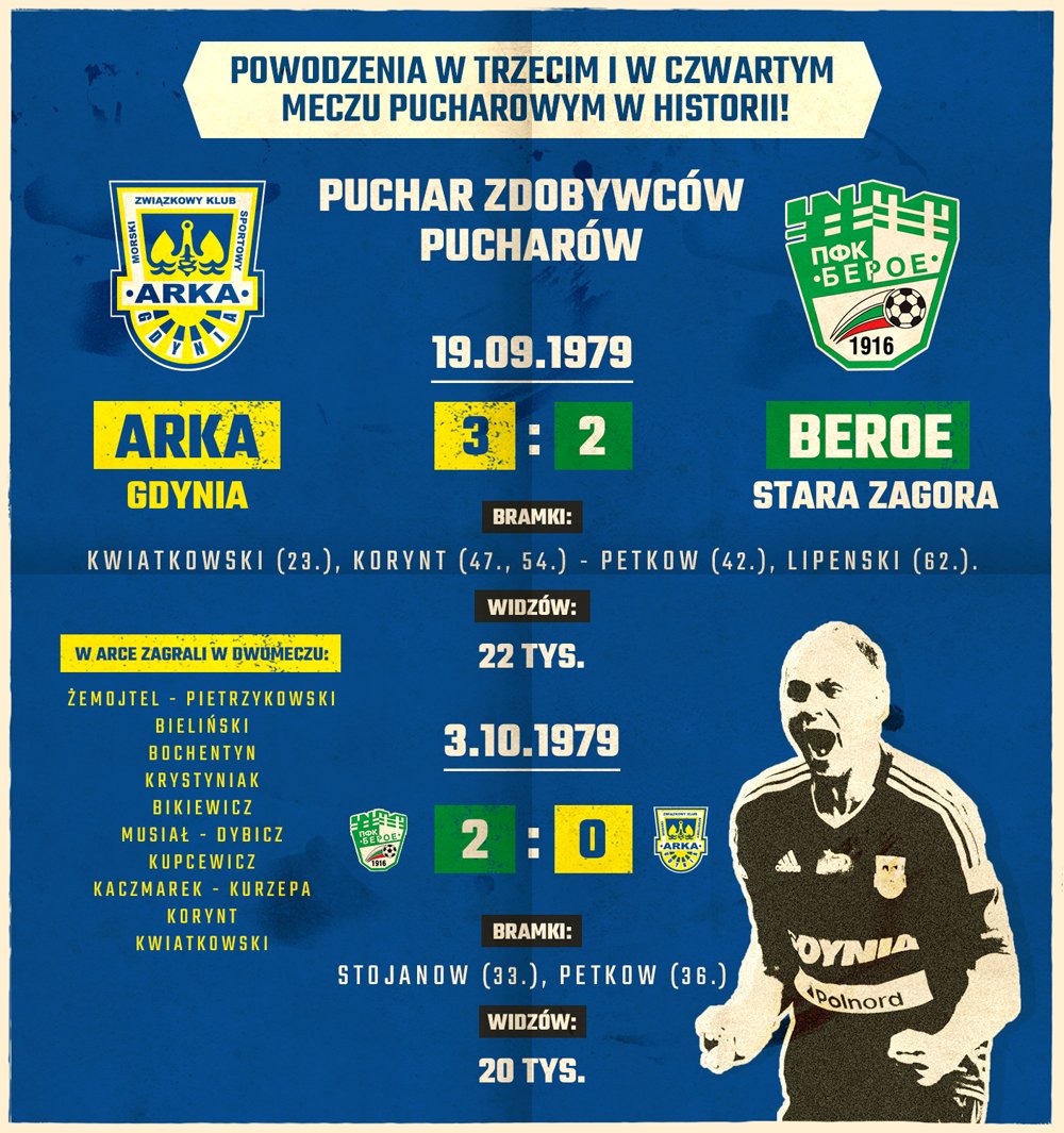 W czwartkowy wieczór Arka Gdynia rozegra swój pierwszy po 38 latach mecz w europejskich pucharach. Rywalizacja z roku 1979 z bułgarskim zespołem Beroe Stara Zagora była jak dotąd jedyna, zakończyła się porażką, a bardzo duży wpływ na tamtą drużynę mieli byli piłkarze szczecińskich klubów.