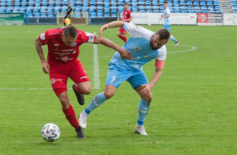 Pojedynek rozpoczął się od ataków Pogoni i już w 5 minucie po strzale Górskiego, Rzepecki interweniował niczym bramkarz piłki ręcznej, odbijając intuicyjnie piłkę twarzą. W 20 minucie tuż obok słupka strzelił Baidoo, a później do głosu doszli stargardzianie. W 25 minucie po centrze Bochnaka, Polkowski strzelił obok bramki, ale trzy minuty później Błękitni objęli prowadzenie, gdy po dośrodkowaniu Bochnaka, Brzeziański główką umieścił piłkę w siatce. W 32 minucie po wrzutce Ostrowskiego, Brzeziańskiemu „zdjął" piłkę jeden z obrońców i nie doszło do podwyższenia wyniku. Dziesięć minut później doszło do podobnej akcji jak ta z golem Brzeziańskiego, z tym, że stargardzcy piłkarze zamienili się rolami i Brzeziański podawał Bochnakowi, ale gola nie udało się zdobyć. Dosłownie chwilę później Repka atomowym strzałem w okienko z półwoleja z linii pola karnego doprowadził do wyrównania, a w doliczonym czasie pierwszej połowy siedlczanie mogli objąć prowadzenie, lecz soczysty strzał został zablokowany i po rykoszecie skończyło się na rzucie rożnym.