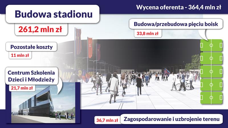 Ponadto Miasto rozbiło koszty związane z budową lub przebudową boisk i budową jedynie budynku Centrum Szkolenia Dzieci i Młodzieży. Koszt budowy samego budynku wyceniono na blisko 22 mln złotych.