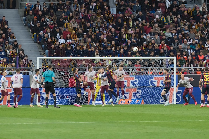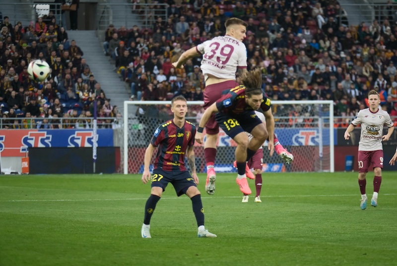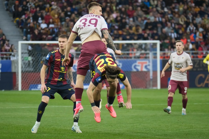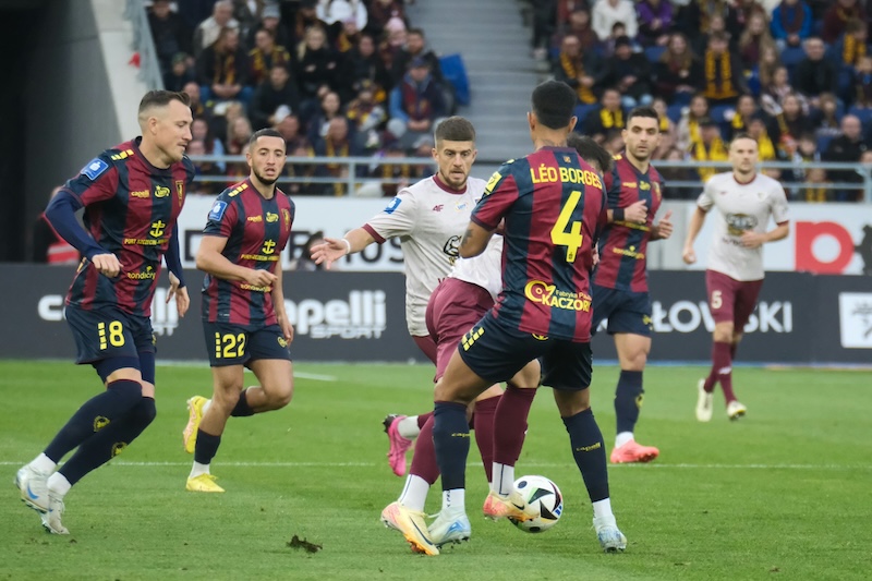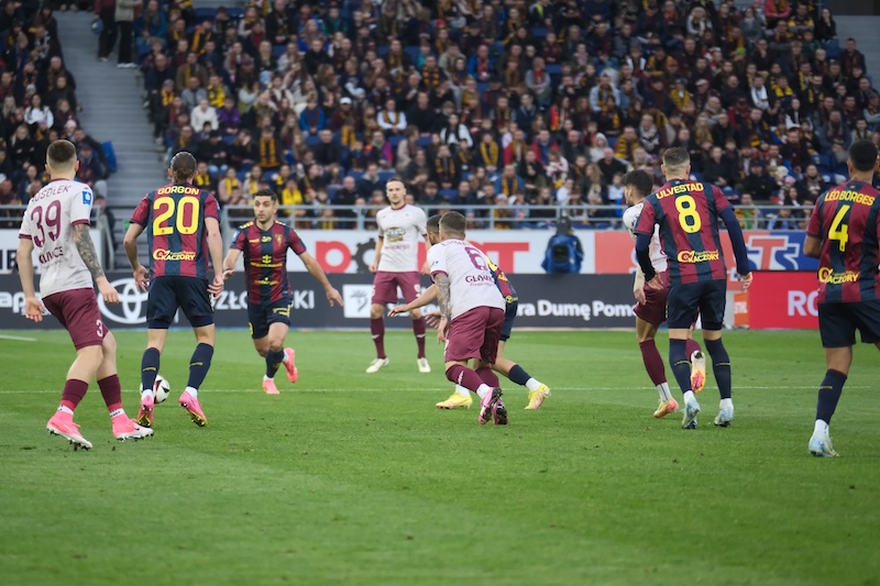 Pierwszą groźną akcję Pogoń miała dopiero w 25. minucie, a jej motorem napędowym był obrońca Koútris, zaś następstwem tej sytuacji było kilka rzutów rożnych szczecinian, następnie strzał Biczachczjana został obroniony, natomiast Ulvestad uderzył za mało precyzyjnie. W końcówce pierwszej połowy świetną okazję miał Félix, ale Cojocaru obronił strzał z kilku metrów, a w doliczonym czasie tej części gry w korzystnej sytuacji Szczepański uderzył nad poprzeczką.