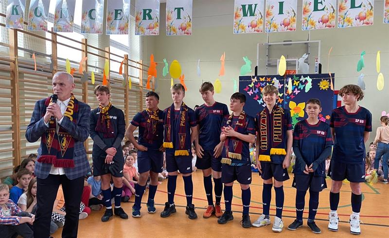 Granie dla Dymka w SP-69 rozpoczęło się już rano na szkolnym boisku, gdzie w meczu Nauczyciele - Uczniowie dwukrotnie 2:1 wygrali pedagodzy (po 2 gole zdobyli Robert Kamiński i Arkadiusz Suchocki). Następnie na kiermaszu wielkanocnym sprzedawane były świąteczne ozdoby przygotowane przez uczniów, ciasta pieczone przez rodziców, gadżety dostarczone przez szczecińską Pogoń oraz koszulka i płyta z autografem zespołu Quo Vadis, który jest autorem hymnu Pogoni. Najmłodsi uczniowie z klas 1-3 specjalnie dla Dymka tańczyli i śpiewali świąteczne piosenki. Na koncert przybył gość honorowy, legenda szczecińskiej Pogoni - Benon Szostakowski, który jest byłym pracownikiem i przyjacielem szkoły. Zebrane podczas imprezy pieniądze dyrektor szkoły wraz z uczniami przekażą Robertowi Dymkowskiemu osobiście. (mij)