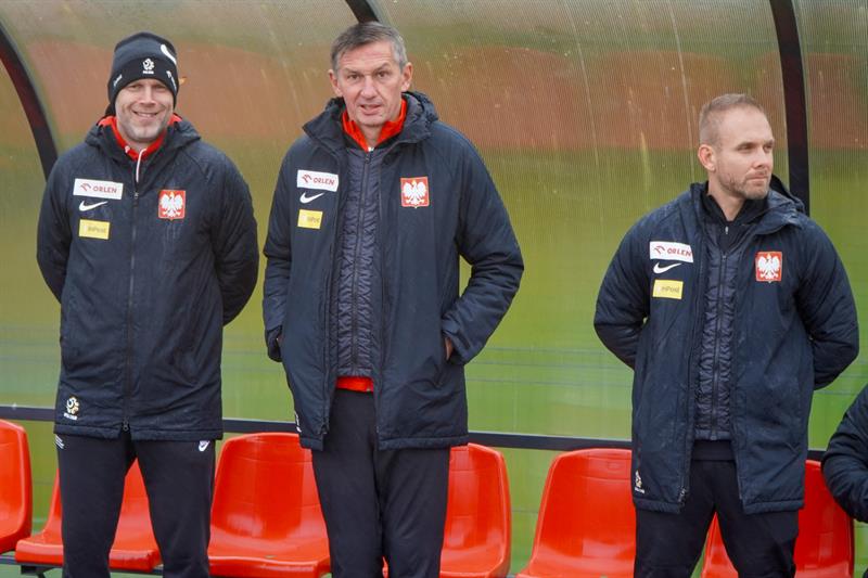 Na zdjęciu: Selekcjoner Dariusz Gęsior (w środku) ze swoim sztabem szkoleniowym podczas meczu reprezentacji Polski do lat 16, który odbył się nie tak dawno w Myśliborzu.