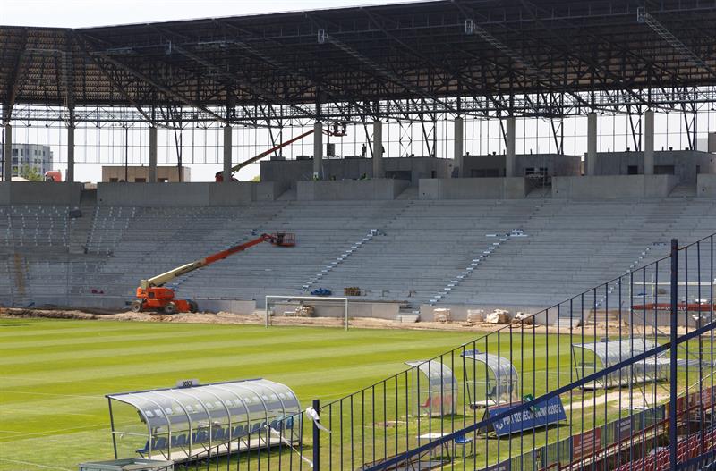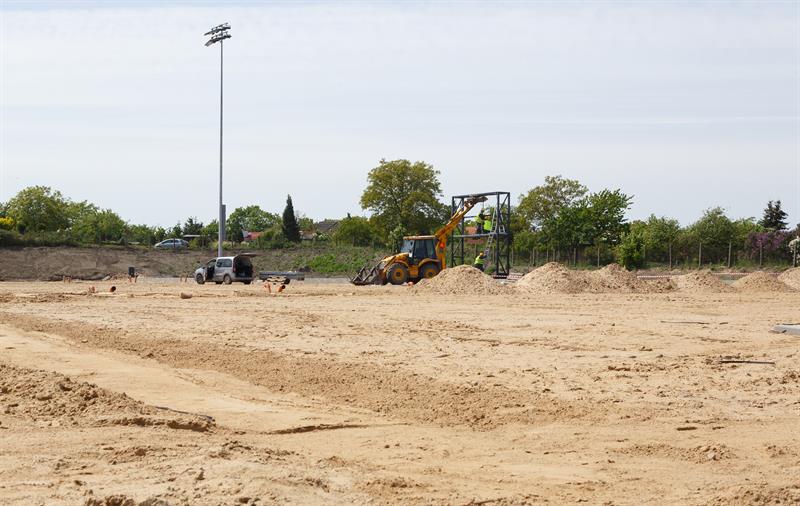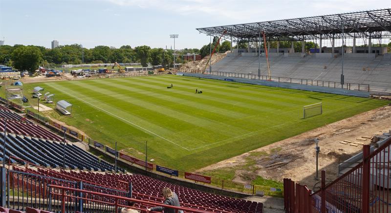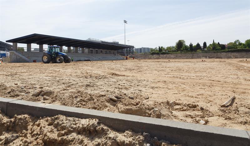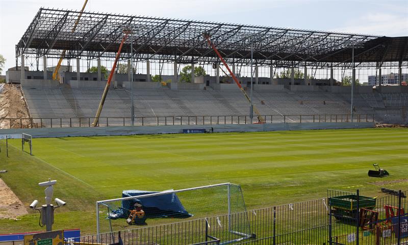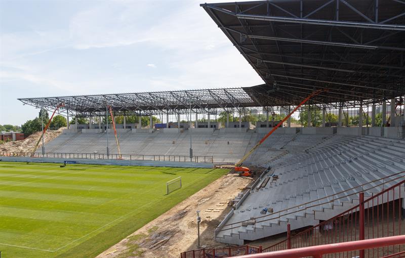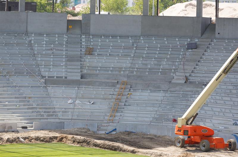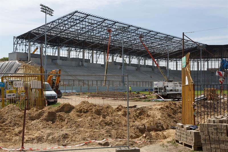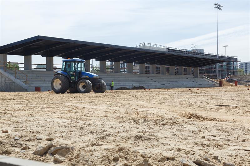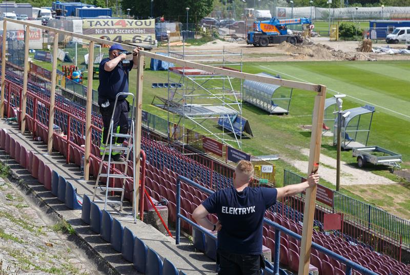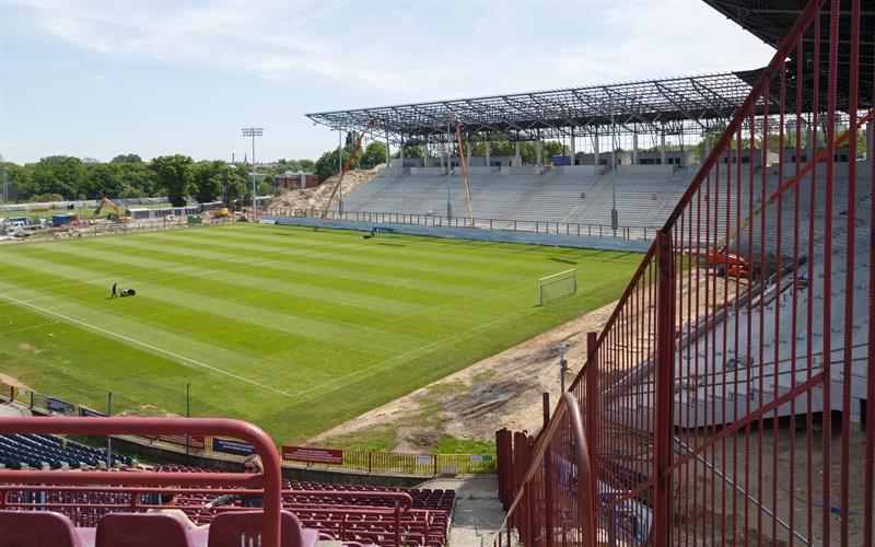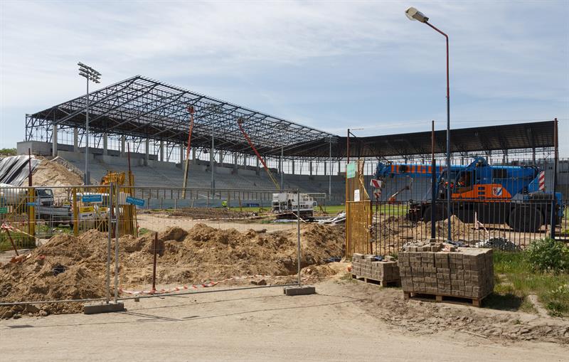 Coraz lepiej wygląda murawa nie tylko boiska głównego, ale również bocznego. Miedzy budową trybuny wschodniej a boiskiem powstał płot odgradzający teren budowy od miejsca, w którym toczyć się będą mecze piłkarskie. Pierwszy mecz zaplanowano już na najbliższy piątek. Obiekt ma być gotowy do organizacji imprezy sportowej rozgrywanej w nietypowych warunkach.